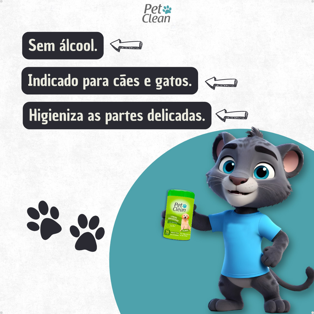 PERGUNTAS FREQUENTES POSSO USAR LENÇO UMEDECIDO EM FILHOTES? O Lenço Umedecido da Pet Clean é indicado para higienização a seco de gatos adultos, sendo contraindicado para filhotes com menos de 2 meses de idade. Para melhor aplicação em filhotes, indicamos a linha especial da própria Pet Clean para Filhotes, clique aqui. O LENÇO UMEDECIDO SUBSTITUI O BANHO NORMAL? Não! Lenços Umedecidos são opções alternativas para limpeza e higiene de gatos, sendo que o banho convencional com água, shampoo e enxague é sempre indicado por ser mais completo. COMO USAR O LENÇO UMEDECIDO? Abra a etiqueta auto-adesiva e retire o primeiro lenço puxando pelo centro. Retire o lenço umedecido e passe nas áreas que deseja higienizar. O QUE FAZER SE O LENÇO UMEDECIDO TOCAR OS OLHOS? Se o Lenço Umedecido vier a tocar os olhos, recomendamos que enxague com água em abundância. Salientamos que o lenço umedecido não tem álcool, o que não será danoso aos olhos do animal. No entanto, recomendamos sempre evitar o contato do produto com os olhos e partes íntimas dos animais. ESSE PRODUTO É A BASE DE ÁLCOOL? Este produto não é a base de álcool. Então não é danoso se o cachorro lamber ou cheirar o lenço, mas de qualquer forma recomenda-se evitar o contato em excesso do paladar e o olfato por precaução! As maiores precauções são o contato com os olhos e as mucosas do animal. O LENÇO UMEDECIDO DA PET CLEAN É HIPOALÉRGICO? Não, apesar de não possuir componentes nocivos e tóxicos aos animais, o produto não é especial para cães alérgicos. Já deu banho no seu peludinho e ele se sujou de novo? Lenço umedecido é uma boa opção prática e econômica! Cachorros limpos e cheirosos são grandes desejos de todos os amantes de animais, não é mesmo? Mas as vezes mesmo quando damos banho, o nosso amiguinho logo depois aparece com as patas sujas de novo! Na correria do dia a dia nem sempre temos tempo para dar banhos frequente em nossos amiguinhos e ainda por cima, banhos super frequentes não são indicados... É por conta disso que Lenços Umedecidos da Pet Clean é uma ótima opção para você que quer ver o seu pet sempre limpo sem precisar ficar dando banho e se molhando toda hora! Lenço Umedecido é uma maneira prática, simples e eficaz para auxiliar na limpeza e bom cheiro de cães e gatos, com lenços você poderá limpar a sujeira do seu amigo antes que ele suba no sofá ou na sua cama! BENEFÍCIOS DO LENÇO UMEDECIDO PET CLEAN: -Neutraliza odores. -Dispensa uso de água e enxague. -Bons aromas para o seu animal através do Aloe Vera. -Fácil aplicação e descarte. -Contribui para remoção de sujeiras pontuais de forma rápida e prática. -Ideal para peles, pelos, orelhas, patas e focinhos. INFORMAÇÕES TÉCNICAS: Produto: Lenço Umedecidos para Cães e Gatos Pet Clean - 75 Unidades Marca: Pet Clean Tipo: Higiene Animal: Cachorros e Gatos Porte: Filhotes acima de 2 meses de vida. Raça Específica: Não Sexo Específico: Não Itens Inclusos: Lenço Umedecidos para Cães e Gatos 75 Unidades - Pet Clean (Macho, Femea, Filhote e Gato). Apresentação: Frasco em Plástico Composição: Lanolina, Cocoamidopropil, Polisorbato, EDTA, Fragância e Conservante. MODO DE USAR Abra a etiqueta auto-adesiva e retire o primeiro lenço puxando pelo centro. Retire o lenço umedecido e passe nas áreas que deseja higienizar. PRECAUÇÕES Evite contato com os olhos e mucosas do animal. Manter longe de alimentos e produtos domésticos. Manter em locais secos, fora do alcance de crianças e animais domésticos. Não utilizar em filhotes com menos de 2 meses de vida. OBSERVAÇÃO O banho a seco não substitui um banho completo com água.