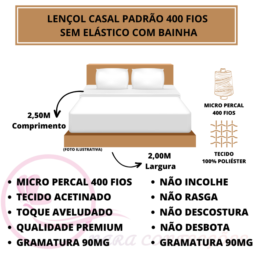 | Lençol Casal Sem Elástico 400 Fios Micro Percal Aveludado Cama Box este produto | R$ 30,66 | 27% | 4.8/5 | 7 |