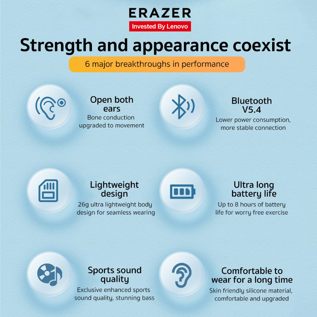 Lenovo Fones De Ouvido Erazer XF22 Fone Bluetooth 5.4 Esportes Sem Fio Condução Óssea Com Microfone Neckband