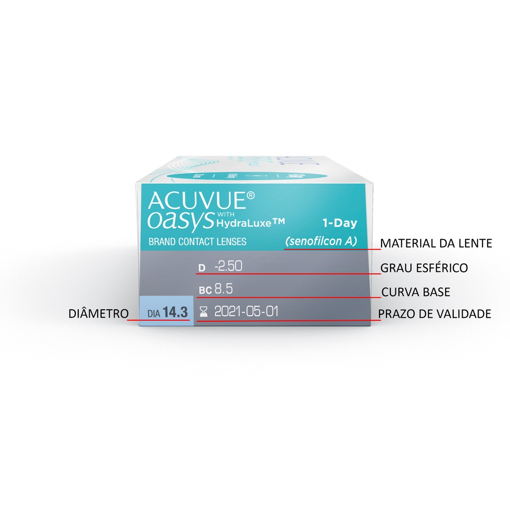 Somos Distribuidor das grandes marcas e estamos a 32 anos no mercado com o maior estoque de toda região par atender imediatamente nossos clientes. LENTES DE CONTATO 1-DAY ACUVUE® OASYS Positivas de : +0,50 até + 8,00 Negativas de : -0,50 ate -12,00 Caixa com 30 lentes de uso diário e descartável. Uma lente de descarte diário desenvolvida para quem faz uso frequente de aparelhos digitais e não abre mão de conforto, saúde ocular e praticidade. VOCÊ SABIA? DOS BRASILEIROS QUE POSSUEM INTERNET 90% USAM TODOS OS DIAS DOS BRASILEIROS QUE TÊM SMARTPHONE EM MÉDIA CHECAM O CELULAR 78x/DIA ESSE NÚMERO CHEGA A 101x/DIA ENTRE PESSOAS DE 18 A 24 ANOS Este hábito pode impactar no conforto durante o uso de lentes de contato. Para essas pessoas agora existe ACUVUE OASYS® 1-Day com HydraLuxe™. CONHEÇA MAIS SOBRE SEUS BENEFÍCIOS DESEMPENHO Nunca superada em conforto, mesmo durante o uso de aparelhos digitais. DESCARTE DIÁRIO Mais confortável, saudável e prática que todas as outras modalidades de descarte. TECNOLOGIA HydraLuxe™ Conforto durante o uso e facilidade no manuseio. NOVA SOLUÇÃO DO BLISTER Melhor sensação na colocação da lente* PROTEÇÃO UV Contêm bloqueador de radiação ultravioleta (UV) que ajuda na proteção da transmissão de radiação UV, nociva à córnea e ao interior dos olhos. EMBALAGEM Lentes de contato de descarte diário disponíveis em embalagem com 30 lentes. Aproveite a praticidade de ter uma nova lente todos os dias. Indicado para correção de Miopia e Hipermetropia. Material: senofilcon A (silicone hidrogel). Indicações: Programa de uso: Descarte Diário. Tecnologia de umectabilidade: HydraLuxeTM Agente umectante (PVP) integrado à matriz da lente. Diâmetro: 14,3mm. Curva base: 8,5mm. Bloqueio UV: Classe 1 (99,9% de UVB, 96,6% de UVA). Conteúdo de água: 38%. Fluxo de oxigênio: 98% (com os olhos abertos). Desenho de borda infinita: Sim. Coeficiente de fricção: < 0,018. Embalagem: 30 unidades de lentes do mesmo grau. ATENÇÃO: Nosso objetivo é vender lentes de contato para quem fez adaptação com Médico Oftalmologista e recebeu orientação adequada, quanto ao uso e cuidados. Consulte regularmente seu médico oftalmologista para avaliar a saúde de seus olhos e saber se pode usar ou continuar usando lentes de contato. TROCA OU DEVOLUÇÃO: Não efetuamos troca ou devolução após a abertura da caixa por se tratar de um produto de saúde. Após a abertura da caixa a garantia é diretamente com o fabricante, se eles autorizarem troca ou devolução do produto, eles irão emitir uma carta de autorização, após isso devem entrar em contato conosco para continuidade Tem dúvidas? Entre em contato! REGISTRO NA ANVISA 80148620072 Produto homologado pela Anvisa