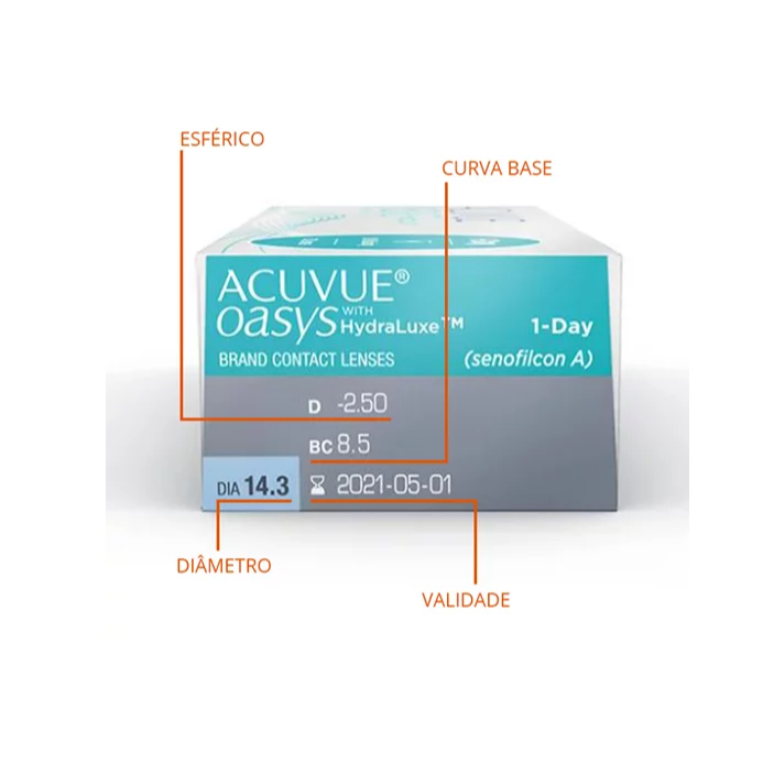 Somos LOJA OFICIAL e Distribuidor das grandes marcas e estamos a 32 anos no mercado. Sempre compre seus produtos nas Lojas Oficiais e aumente suas vantagens e segurança! LENTES DE CONTATO 1-DAY ACUVUE® OASYS Positivas de : +0,50 até + 8,00 Negativas de : -0,50 ate -12,00 Caixa com 30 lentes de uso diário e descartável. Uma lente de descarte diário desenvolvida para quem faz uso frequente de aparelhos digitais e não abre mão de conforto, saúde ocular e praticidade. VOCÊ SABIA? DOS BRASILEIROS QUE POSSUEM INTERNET 90% USAM TODOS OS DIAS DOS BRASILEIROS QUE TÊM SMARTPHONE EM MÉDIA CHECAM O CELULAR 78x/DIA ESSE NÚMERO CHEGA A 101x/DIA ENTRE PESSOAS DE 18 A 24 ANOS Este hábito pode impactar no conforto durante o uso de lentes de contato. Para essas pessoas agora existe ACUVUE OASYS® 1-Day com HydraLuxe™. CONHEÇA MAIS SOBRE SEUS BENEFÍCIOS DESEMPENHO Nunca superada em conforto, mesmo durante o uso de aparelhos digitais. DESCARTE DIÁRIO Mais confortável, saudável e prática que todas as outras modalidades de descarte. TECNOLOGIA HydraLuxe™ Conforto durante o uso e facilidade no manuseio. NOVA SOLUÇÃO DO BLISTER Melhor sensação na colocação da lente* PROTEÇÃO UV Contêm bloqueador de radiação ultravioleta (UV) que ajuda na proteção da transmissão de radiação UV, nociva à córnea e ao interior dos olhos. EMBALAGEM Lentes de contato de descarte diário disponíveis em embalagem com 30 lentes. Aproveite a praticidade de ter uma nova lente todos os dias. Indicado para correção de Miopia e Hipermetropia. Material: senofilcon A (silicone hidrogel). Indicações: Programa de uso: Descarte Diário. Tecnologia de umectabilidade: HydraLuxeTM Agente umectante (PVP) integrado à matriz da lente. Diâmetro: 14,3mm. Curva base: 8,5mm. Bloqueio UV: Classe 1 (99,9% de UVB, 96,6% de UVA). Conteúdo de água: 38%. Fluxo de oxigênio: 98% (com os olhos abertos). Desenho de borda infinita: Sim. Coeficiente de fricção: < 0,018. ATENÇÃO: Nosso objetivo é vender lentes de contato para quem fez adaptação com Médico Oftalmologista e recebeu orientação adequada, quanto ao uso e cuidados. Consulte regularmente seu médico oftalmologista para avaliar a saúde de seus olhos e saber se pode usar ou continuar usando lentes de contato. TROCA OU DEVOLUÇÃO: Não efetuamos troca ou devolução após a abertura da caixa por se tratar de um produto de saúde. Após a abertura da caixa a garantia é diretamente com o fabricante, se eles autorizarem troca ou devolução do produto, eles irão emitir uma carta de autorização, após isso devem entrar em contato conosco para continuidade Tem dúvidas? Entre em contato! REGISTRO NA ANVISA - 80148620019 Produto homologado pela Anvisa Resp. Técnico Evelise S. Godoy - CRQ 04345341