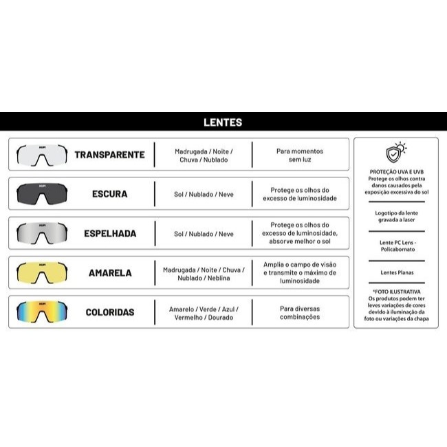 As lentes para os óculos HUPI são projetadas para proporcionar um desempenho aprimorado durante atividades como pedalar ou correr. Além de oferecerem proteção contra os raios UVA e UVB, possuem algumas características específicas. Aqui estão os detalhes: Proteção UVA e UVB: As lentes são projetadas para bloquear os raios UVA e UVB prejudiciais, protegendo seus olhos dos danos causados pelo sol. Material da lente: As lentes são feitas de policarbonato, um material leve e resistente, que oferece durabilidade e resistência a impactos. Lentes planas: As lentes são planas, o que significa que não possuem curvatura acentuada. Gravação do logotipo: O logotipo da HUPI é gravado a laser na lente e também pode ser encontrado em alto-relevo na lateral dos óculos. Isso garante a autenticidade e a qualidade do produto. É importante ressaltar que, além da qualidade da lente em termos de proteção solar, é recomendado considerar a cor da lente com base no clima da sua região. A seguir, temos um exemplo das cores de lentes disponíveis: Lente espelhada: Ideal para dias ensolarados, onde há maior intensidade de luz. Ela reduz o brilho e proporciona uma visão mais nítida em condições de luminosidade intensa. Lente fotocromática: Essas lentes têm a capacidade de se adaptar à luminosidade ambiente, escurecendo em resposta à luz solar intensa e clareando em ambientes internos ou com menor luminosidade. Lembrando que é essencial verificar o modelo dos óculos HUPI para garantir a compra correta da lente, pois os modelos podem ter características diferentes e específicas.