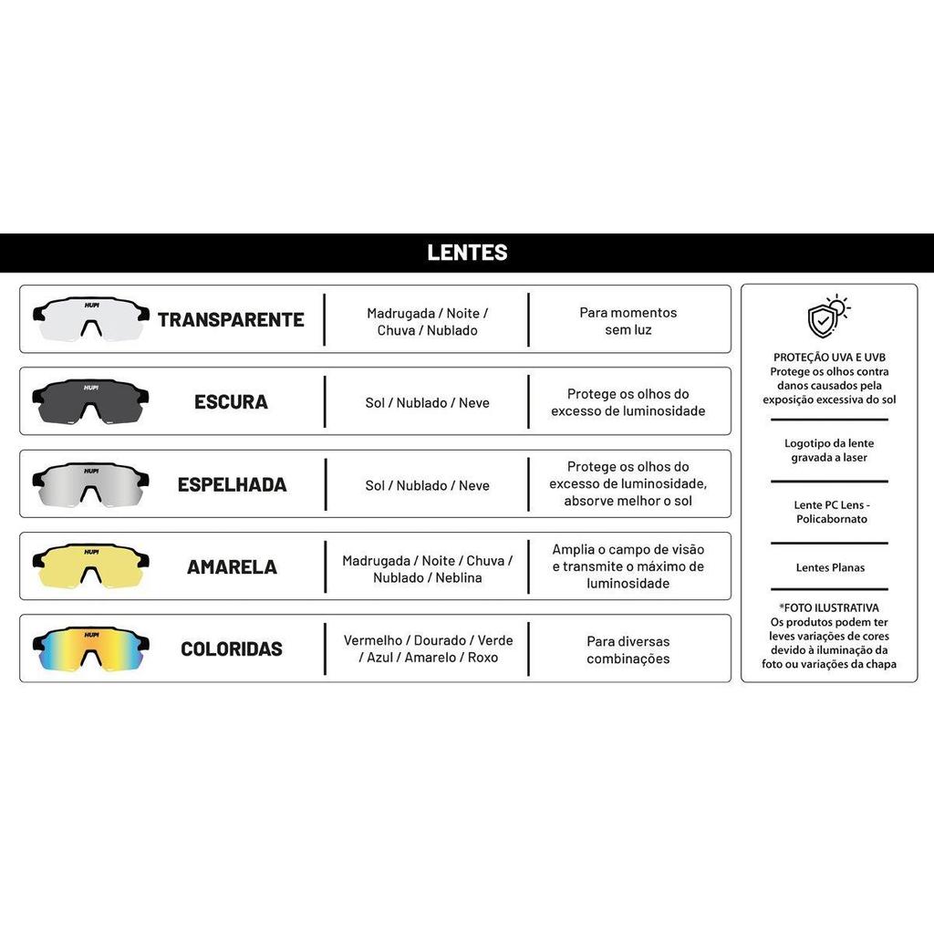 Lente Extra Quiriri Transparente As lentes para os óculos HUPI são projetadas para proporcionar um desempenho aprimorado durante atividades como pedalar ou correr. Além de oferecerem proteção contra os raios UVA e UVB 400 e UV400 com garantia vitalícia, possuem algumas características específicas. Aqui estão os detalhes: Proteção UVA e UVB 400: As lentes são projetadas para bloquear os raios UVA e UVB 400 prejudiciais, protegendo seus olhos dos danos causados pelo sol. Material da lente: As lentes são feitas de policarbonato, um material leve e resistente, que oferece durabilidade e resistência a impactos. Lentes planas: As lentes são planas, o que significa que não possuem curvatura acentuada. Isso pode proporcionar uma visão mais clara e sem distorções. Gravação do logotipo: O logotipo da HUPI é gravado a laser na lente e também pode ser encontrado em alto-relevo na lateral dos óculos. Isso garante a autenticidade e a qualidade do produto. É importante ressaltar que, além da qualidade da lente em termos de proteção solar, é recomendado considerar a cor da lente com base no clima da sua região. A escolha da cor da lente pode afetar a quantidade de luz que é filtrada, proporcionando maior conforto visual em diferentes condições de luminosidade. A seguir, temos um exemplo das cores de lentes disponíveis e as condições climáticas para ajudá-lo a fazer a compra. correta da sua lente: Lente espelhada: Ideal para dias ensolarados, onde há maior intensidade de luz. Ela reduz o brilho e proporciona uma visão mais nítida em condições de luminosidade intensa. Lembrando que é essencial verificar o modelo dos óculos HUPI para garantir a compra correta da lente, pois os modelos podem ter características diferentes e específicas. Peso Aproximado: 12,5g * Foto ilustrativa. Os produtos podem ter leves variações de cores devido à iluminação da foto ou variações da chapa.