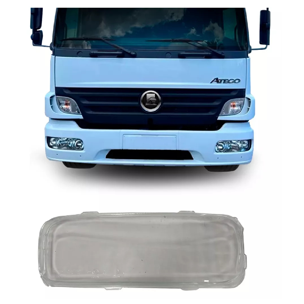 Lente Lisa do Farol Principal Compatível com os Caminhões Mercedes-Benz Modelos De 2004 Até 2012 Modelos De Aplicação: - Atego 1315 - Atego 1418 - Atego 1518 - Atego 1718 - Atego 1725 - Atego 1728 - Atego 2425 - Atego 2428 - Dimensões Aproximadas: Altura 16,5cm x Largura 47cm Comprimento 5cm - Peça fabricada em Vidro