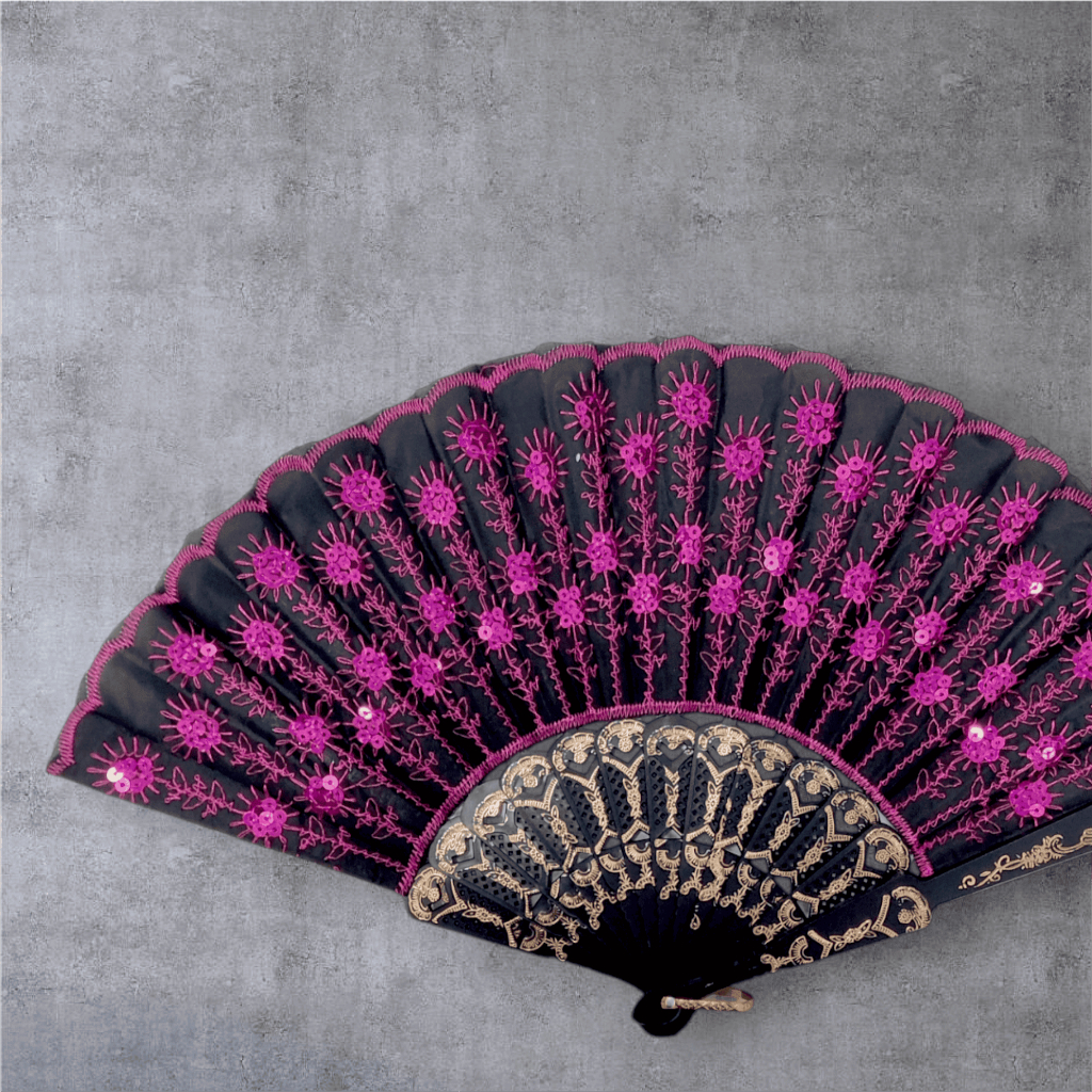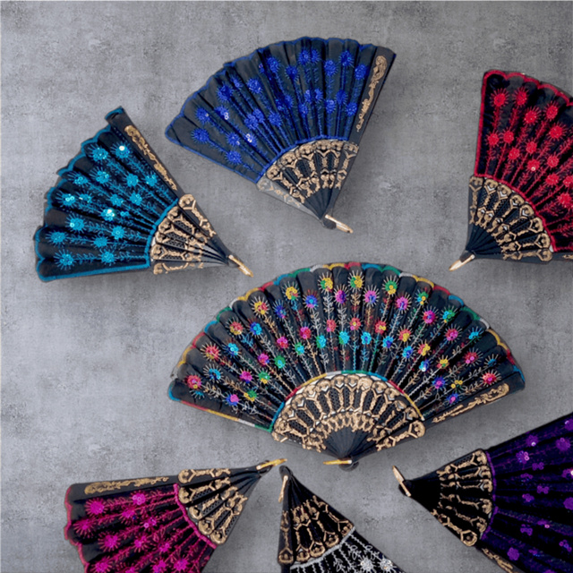 Leque Tecido Lantejoula Brilhante Varias Estampas Diversas Cor Madeira Escuro Oriental Japonês Gueixa