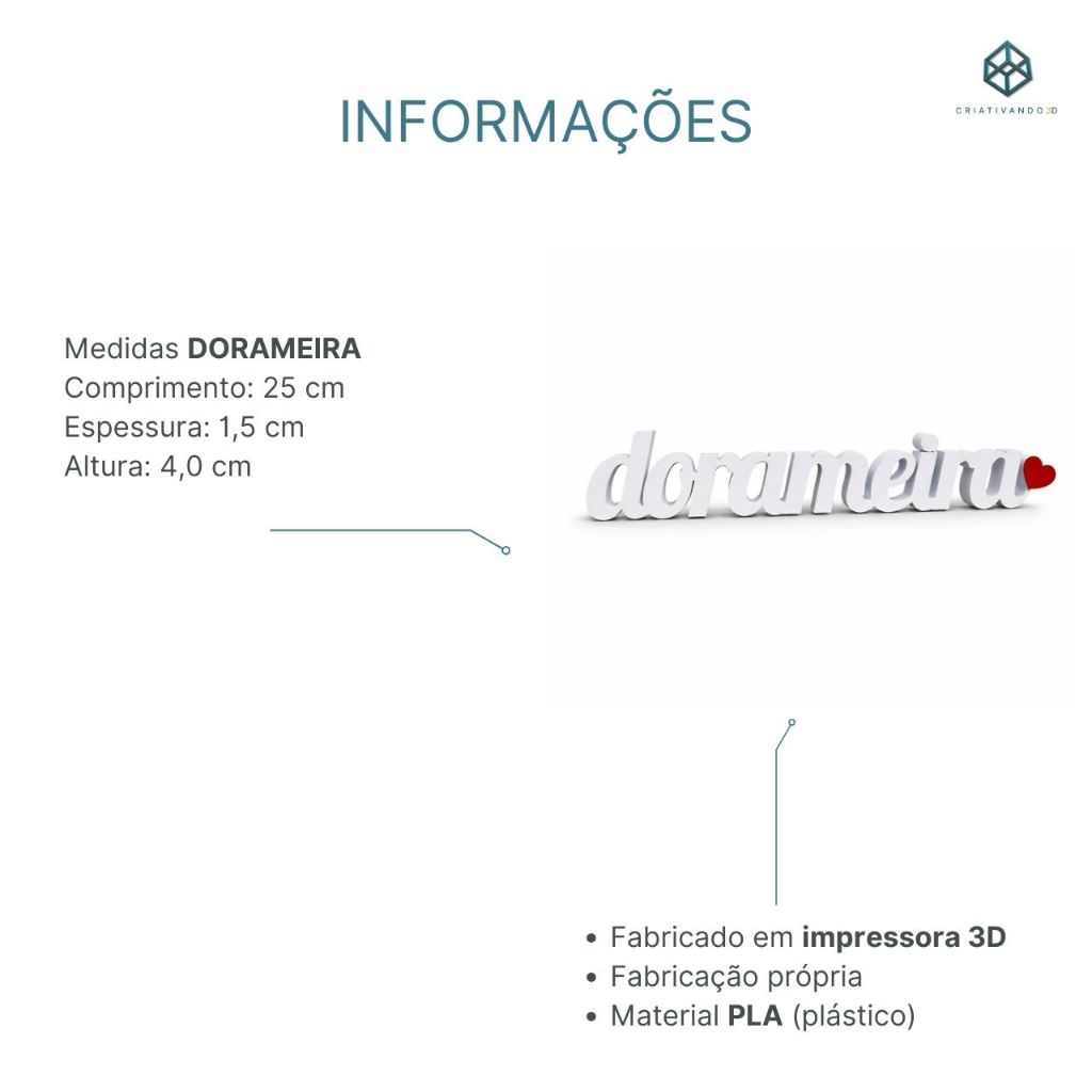 LEIA COM ATENÇÃO AS INFORMAÇÕES DO PRODUTO * ESCOLHA A COR DO LETREIRO/MÃOZINHA E DO CORAÇÃO INFORMAÇÕES: - Fabricado em impressora 3D - Fabricação Própria (CRIATIVANDO 3D) - Material PLA (plástico) Medidas Letreiro Dorameira Comprimento: 25 cm Espessura: 1,5 cm Altura: 4,0 cm Medidas Mãozinha Largura: 8,0 cm Espessura: 1,5 cm Altura: 16,8 cm Medidas KPOP Largura: 15,0 cm Espessura: 2,0 cm Altura: 4,5 cm Medidas COREIA DO SUL Largura: 19,5 cm Espessura: 1,6 cm Altura: 2,4 cm CUIDADOS: - Utilizar apenas pano seco ou umedecido em água para realizar a limpeza da peça - Não é indicado deixar exposto ao sol e a altas temperaturas OBS: Marcas de suporte e linhas são características comuns de produtos impressos em 3D, portanto não são considerados defeitos. Enviamos para todo Brasil!