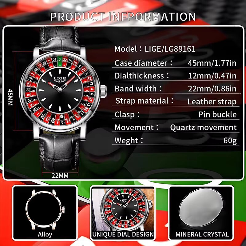 LIGE Moda Relógio De Couro Masculino Unissex Mostrador Rotativo Roleta Pulso Luminoso À Prova D'água