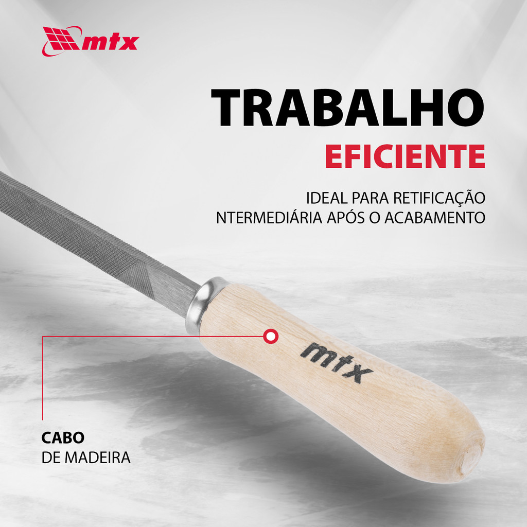 Lima Triangular MTX 1602655 – 200 mm Ferramenta essencial para afiação e acabamento intermediário em metais, indicada para profissionais da mecânica e entusiastas do faça você mesmo. Com cabo em madeira e lâmina de 200 mm, oferece precisão e eficiência em diversas aplicações. Principais Características: Durabilidade e Resistência • Parte de trabalho em aço carbono resistente ao desgaste • Mantém a eficácia e a afiação mesmo após uso prolongado • Cabo de madeira com revestimento em laca para proteção contra lascas Alta Produtividade • Corte cruzado nº 2 para remoção rápida e eficiente de material • Ideal para lixamento intermediário após uso de lima bastarda • Garante acabamento de qualidade em superfícies metálicas duras Conforto e Ergonomia • Cabo anatômico e confortável que se adapta bem à mão • Reduz a fadiga durante trabalhos longos • Superfície lisa e segura graças ao revestimento protetor Aplicações: Afiação de bordas, cantos internos e furos triangulares Acabamento em ferramentas e peças metálicas Uso profissional em oficinas mecânicas Projetos domésticos e trabalhos manuais de precisão Benefícios: Ferramenta robusta e confiável para uso contínuo Acabamento preciso e eficiente Manuseio confortável para maior produtividade Versátil para diversas tarefas de acabamento e afiação A Lima Triangular MTX 1602655 é a escolha ideal para quem busca uma ferramenta durável, eficiente e confortável, capaz de proporcionar resultados profissionais em uma ampla variedade de trabalhos com metais.