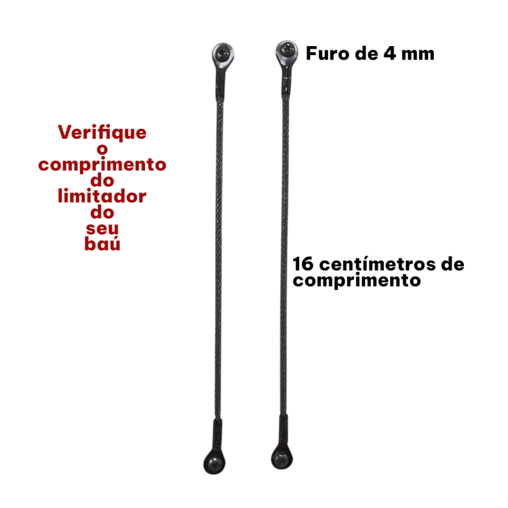 Garanta mais segurança para o seu baú de moto com o limitador de tampa em aço inoxidável Resistente à corrosão e de fácil instalação, este acessório é ideal para entregadores e motociclistas que utilizam baús Givi, Shad, com limitador na medida de 16cm parafusado. Perfeito para delivery, com durabilidade garantida Limitador para baú de moto em aço com 16cm. Este limitador é projetado para se adaptar aos baús com a medida do limitador de 16cm Fabricado com materiais de alta qualidade, a alça interna proporciona uma pegada firme, facilitando o acesso ao conteúdo do baú. Sua instalação é simples e rápida( em alguns casos pode ser preciso adequar a furação no baú) Ideal para motociclistas e amantes de aventuras ao ar livre, este acessório é essencial para quem valoriza a eficiência e a segurança em cada viagem. Não deixe de equipar sua moto ou quadriciclo com nosso limitador universal. Super resistente por seu material ser de aço inox. Esse limitador serve para qual modelo de baú? R: Compatível com todas marcas de baú de plástico com limitador na medida de 16cm. O que vem incluso no kit? R: Dois limitadores em aço inox + quatro parafusos de 6mm. Pronto para instalação. Precisa furar o baú? R: Em alguns modelos, sim. Outros já vêm com os furos próprios para esse limitador. Qual o tamanho do limitador? R: Comprimento total de 16 cm e furos dos terminais de 4mm Fabricado em cabo de aço revestido com conectores em aço inox. O limitador é resistente? R: Sim ele suporta 25 quilos de tração. Aguenta o peso da tampa? R: Sim, foi desenvolvido para suportar a tampa aberta com segurança, sem danificar o baú ou forçar a dobradiça. O limitador trava a tampa ou só limita a abertura? R: Este modelo apenas limita a abertura, evitando que a tampa vá além do ângulo permitido e danifique as dobradiças. Posso usar para substituir o limitador original do meu baú? R: Sim, é ideal como uma peça de reposição desde que o limitador antigo seja também de 16cm de comprimento. É vendido o par ou unidade? R: O anúncio é referente a 1 par. PALAVRAS-CHAVE cabo limitador 90° baú moto, trava segurança dobradiça baú, limitador abertura baú moto, cabo proteção dobradiça 90°, acessório baú moto anti-quebra, kit limitador universal.