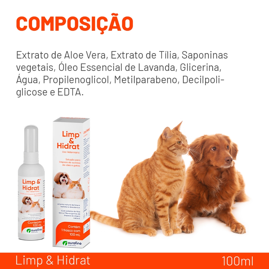 A LeluPets nasceu de uma paixão e dedicação de aproximadamente 20 anos de experiência nessa área tão incrível. Desde o início de nossa história, já são mais de 100 mil clientes atendidos. Estamos aqui determinados em fazer a diferença, democratizando e simplificando o cuidado com o seu pet para oferecer a melhor experiência para você e seu amiguinho. Mantemos nossas orelhas em pé, atentos às novidades do mundo pet para trazê-las até você. Nós somos apaixonados por pets! O seu pet é também da nossa família! Solucao Limpeza Ouvidos de Caes e Gatos LIMP E HIDRAT 100 ml Solução própria para limpeza de ouvidos de cães e gatos, composto com componentes que removem o excesso de oleosidade e cerúmen acumulados no ouvido externo, sem causar irritabilidade. - Indicado para cães e gatos - Auxilia na limpeza auditiva externa; - Conta com compostos naturais; - Disponível em frasco com 100ml