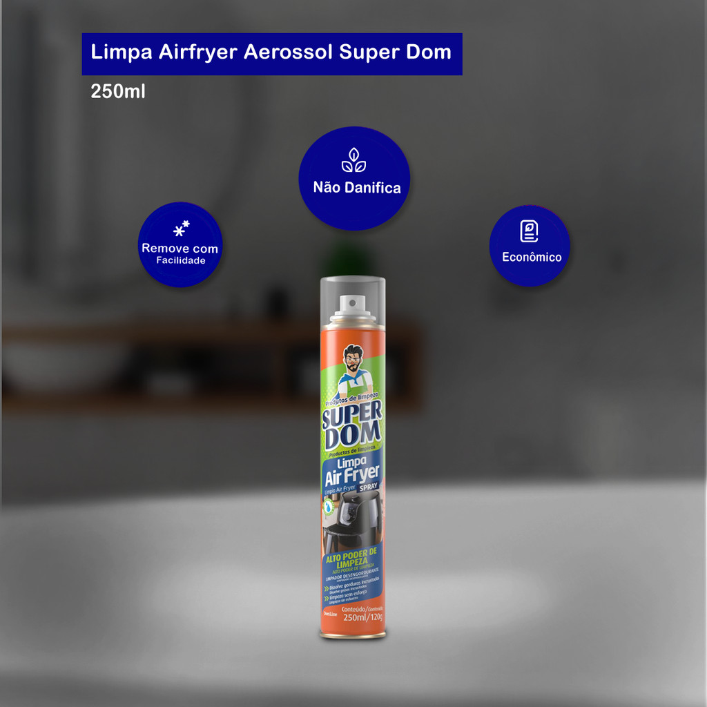 Limpa Air Fryer Aerossol Super Dom 250ml Dom Line O Limpa Air Fryer Aerossol Super Dom é a solução prática e eficaz para manter sua air fryer sempre limpa e livre de resíduos de gordura. Sua fórmula de ação rápida facilita a remoção de sujeira e gordura acumulada, proporcionando mais praticidade e eficiência na manutenção do seu aparelho. O produto é fácil de aplicar, com um jato direcionado que alcança as partes de difícil acesso, como a cesta e a parte interna da air fryer. Você mantém sua air fryer sempre higienizada, preservando o sabor dos alimentos e evitando odores desagradáveis. Indicação de Uso: - Desenvolvido para remover rapidamente sujeiras, gorduras e odores, garantindo uma limpeza profunda sem danificar os componentes da sua Air Friyer. Embalagem: 01 frasco de 250ml