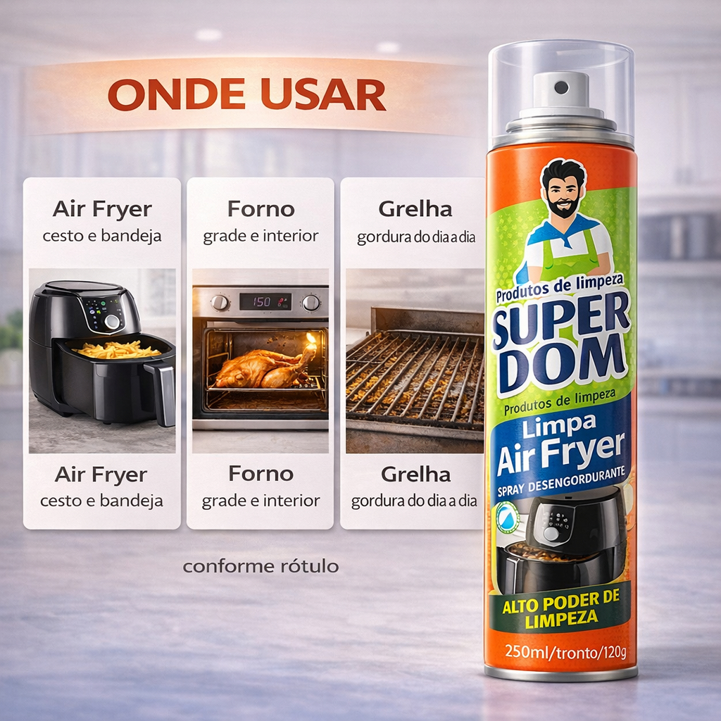 Limpa Air Fryer Spray 250ml Super Dom Remove Gordura Pesada Limpeza Rápida Desengordurante Facil Uso