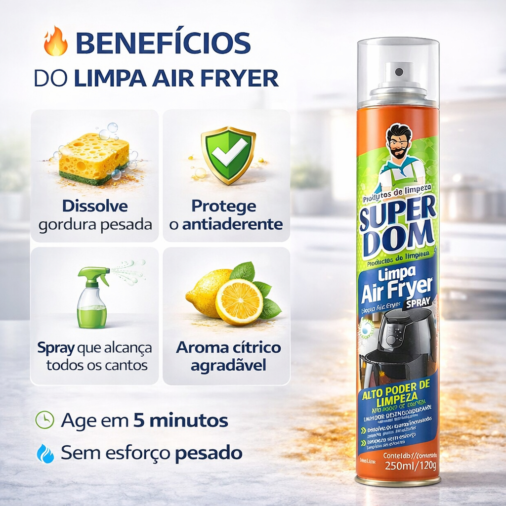 ✨ Spray Limpa Air Fryer Super Dom 250ml Sua Air Fryer nova, sem esforço e em minutos! O Super Dom é o desengordurante de alta performance criado especificamente para dissolver a gordura incrustada sem riscar ou danificar o cesto. Ganhe tempo e conserve seu eletrodoméstico com o brilho original. ✅ Por que escolher o Super Dom? ✅ Ação Instantânea: Dissolve a gordura pesada sem precisar esfregar por horas. ✅ Proteção Total: Fórmula segura que não agride o revestimento antiaderente. ✅ Praticidade Spray: Aplicação rápida que alcança todos os cantos do cesto. ✅ Brilho e Frescor: Deixa um aroma cítrico agradável e aspecto de produto novo. 🧼 Modo de Uso Simples: 🧼 Aplique: Borrife o spray a 20cm da superfície (com o aparelho frio). 🧼 Aguarde: Deixe agir por 5 minutos para a gordura amolecer. 🧼 Enxágue: Passe uma esponja macia e lave normalmente.