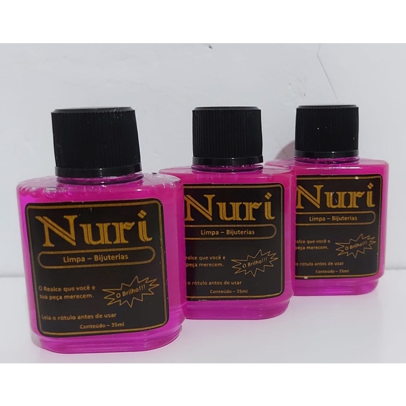 Líquido usado para limpar Cordões, Anéis, Brincos, Pulseiras em Bijuteria Cada Frasco com 35 ml cada. ⚠️Como usar: - Despeje o Nuri Limpa Bijuteria em um recipiente - Deixe sua peça imersa por 10 segundos - Retire com o auxílio de algum objeto (garfo, por exemplo) - Enxague em água abundante - Coloque um pouco de detergente neutro sobre a peça - Em seguida a enxague novamente - Seque a peça com um secador de cabelo no quente ou uma flanela - Não risca e nem desgasta a prataria. – Os líquidos limpa Nuri retiram a oxidação e a gordura, deixando ainda, uma camada de proteção no objeto. – Não é indicado para ligas de estanho, antimônio, ferrosos ou aço inoxidável. - Pronto, sua peça estará limpa!