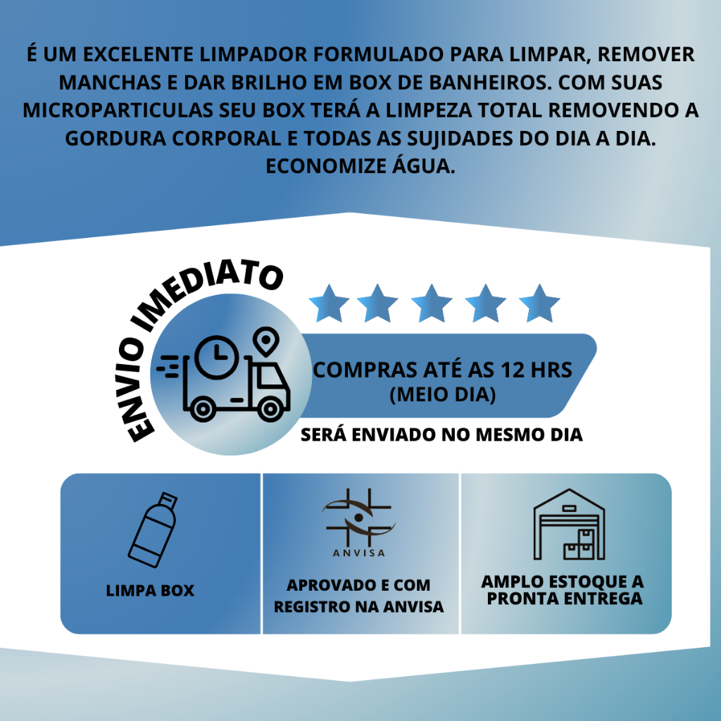Renova Limpa Box – Limpeza Profunda e Brilho Impecável para Seu Banheiro O Renova Limpa Box é a escolha ideal para quem deseja praticidade e resultados visíveis na limpeza do box do banheiro. Sua fórmula exclusiva atua de forma eficaz na remoção de sujeiras, manchas e gordura corporal, devolvendo o brilho e a aparência de novo ao vidro. Principais Benefícios: Limpeza profunda: remove facilmente gordura, manchas e resíduos do dia a dia Brilho renovado: devolve o aspecto de novo ao seu box Fácil de usar: não precisa de força ou produtos complementares Economia de água: limpeza eficaz com menos enxágue Rendimento excelente: basta uma pequena quantidade para grandes resultados Como usar: Aplique uma pequena quantidade de Renova Limpa Box em um pano limpo Esfregue no box com movimentos circulares, cobrindo toda a superfície Finalize com um pano seco para dar brilho. Se necessário, enxágue para remover resíduos Ideal para: Box de vidro fosco ou transparente Superfícies manchadas por gordura corporal ou resíduos de banho Limpezas rápidas no dia a dia sem esforço Transforme a limpeza do seu box em uma tarefa simples, rápida e eficiente. Garanta agora o Renova Limpa Box e mantenha seu banheiro sempre limpo, brilhante e com aparência renovada.