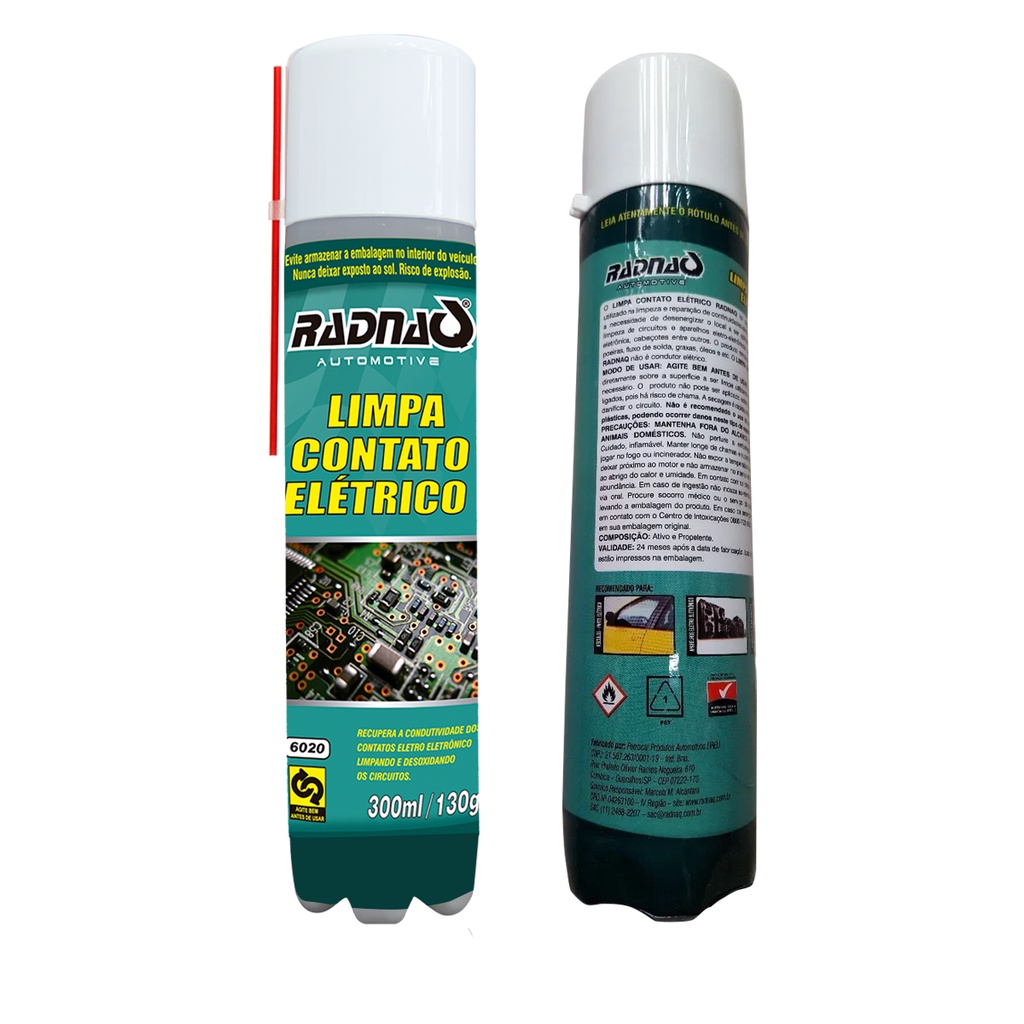 Limpa Contato Elétrico Universal 300Ml Radnaq Aerosol Desoxida Circuitos - Uso Geral Nossos produtos são enviados em até 24 horas úteis e embalados com muito cuidado para fornecer pra você uma experiência incrível. O Limpa Contato Elétrico Radnaq foi desenvolvido para ser utilizado na limpeza e reparação de continuidades elétricas em contatos com a necessidade de desenergizar o local a ser aplicado. É indicado para limpeza de circuitos e aparelhos eletro-eletrônicos, sistemas de injeção eletrônica, cabeçotes entre outros. O produto remove agentes corrosivos, poeiras, fluxo de solda, graxas, óleos e etc. O Limpa Contato Elétrico Radnaq não é condutor elétrico. * Modo de Usar: AGITE BEM ANTES DE USAR * Aplique o produto diretamente sobre a superfície a ser limpa utilizando o extensor quando necessário. O produto não pode ser aplicado sobre circuitos eletrônicos ligados, pois há risco de chama. A secagem é rápida, não havendo perigo de danificar o circuito. Não é recomendado o uso do produto em partes plásticas, podendo ocorrer danos neste tipo de superfície. Composição: Ativo e Propelente. [RECOMENDADO PARA] • Veículos - Parte Elétrica • Aparelhos Eletro Eletrônico • Aparelhos de Informática [DÚVIDAS FREQUENTES] • Os produtos são novos? R: Só trabalhamos com produtos novos e com garantia. • Como funciona a garantia? R: Nossos produtos têm uma etiqueta de garantia para nosso controle interno, com essa etiqueta verificamos se o produto é nosso mesmo, portanto NÃO tire a etiqueta do produto. • O produto está disponível a pronta entrega? R: Sim, todos os nossos produtos estão no nosso estoque preparado para ser embalado e enviado pra você! Ficou alguma dúvida? Esclareça sua dúvida no chat! Ficamos à disposição para esclarecer qualquer dúvida que tenha surgido, faça sua pergunta no chat, vamos lhe atender com o maior prazer!