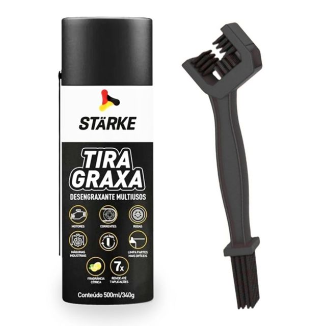 Spray Limpa Corrente + Escova Faça a manutenção correta e aumente a vida útil de sua moto. Para o melhor desempenho e durabilidade da sua corrente, é necessário os devidos cuidados. Conteúdo da Embalagem: 01 Spray de Tira Graxa 500ml Starke 01 Escova Para Limpeza O TIRA GRAXA STÄRKE é um Desengraxante Multiusos desenvolvido para limpeza de motores, correntes de motocicletas e bicicletas, rodas, máquinas industriais, limpeza de pisos de garagens e oficinas, grelhas de churrasqueira e outros materiais impregnados de sujidades. Remove graxa, óleo, fuligem e sujeiras de superfícies. Pode ser utilizado em corrente o-ring, o produto não corrói os anéis. Modo de usar: 1 – Limpar a corrente previamente com Tira Graxa Starke 2 – Agitar a embalagem antes da aplicação. 3 – Salpicar a corrente com Lubrificante Starke pela parte do interior da mesma ao longo de todo a extensão. 4 – Deixar repousar durante uns minutos para permitir a evaporação do dissolvente.