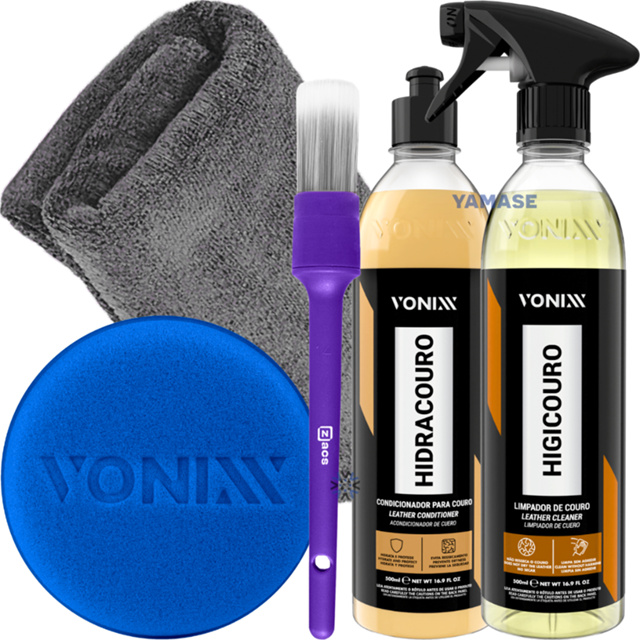 Limpa Couro Higicouro Vonixx + Hidracouro Vonixx + Toalha Microfibra + Aplicador e Pincel para Detalhamento Kit