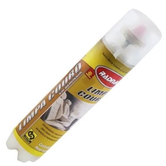 LIMPA E HIDRATA COURO SPRAY (300ML) RADNAQ O Limpa Couro Aerossol Radnaq é um produto de alta qualidade que limpa e protege o couro e o vinil, sem modificar as propriedades naturais e dando brilho. Sua fórmula proporciona à superfície um aspecto sempre novo. Evita rachaduras e envelhecimento precoce. O Limpa Couro Aerossol Radnaq é de fácil aplicação permitindo dosagens que evitam desperdícios. O produto é ideal para proteger estofados de couro de seu carro evitando ressecamento, também é recomendado para limpeza de artigos de couro liso e sintético sem agredi-los. Pode ser utilizado em artigos como: calçados, bolsas, cintos, jaquetas e outros. MODO DE USAR: Agite bem antes de usar. Teste inicialmente em área não aparente certificando-se da compatibilidade do produto com a superfície e reação com cores da mesma. Aplique o Limpa Couro Aerossol Radnaq de maneira uniforme, a distância de aproximadamente 20cm da superfície a ser limpa;