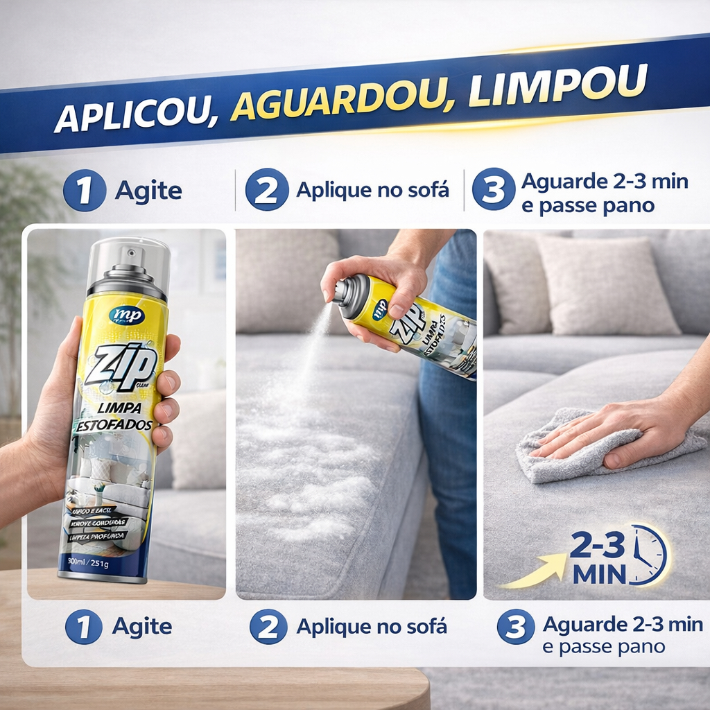 Zip Limpa Estofados Spray 300ml 🚀🛋️ Seu Sofá Limpo Como Novo em Minutos Características do produto: ✅ Espuma mágica que limpa sem encharcar ✅ Elimina sujeiras profundas e gordura ✅ Ação rápida e eficiente ✅ Indicado para sofás, tapetes e colchões ✅ Excelente para limpeza interna de veículos ✅ Fácil aplicação e secagem rápida Você vai receber em sua casa: 📦 1x Zip Limpa Estofados Spray 300ml 📦 Embalagem segura e bem protegida 📦 Pronto para uso imediato Recomendações de Uso: 👉 Agite antes de aplicar 👉 Pulverize lentamente na superfície desejada 👉 Aguarde 2 minutos para agir 👉 Retire com pano úmido 👉 Evite contato com alimentos, aquários, chamas ou superfícies aquecidas