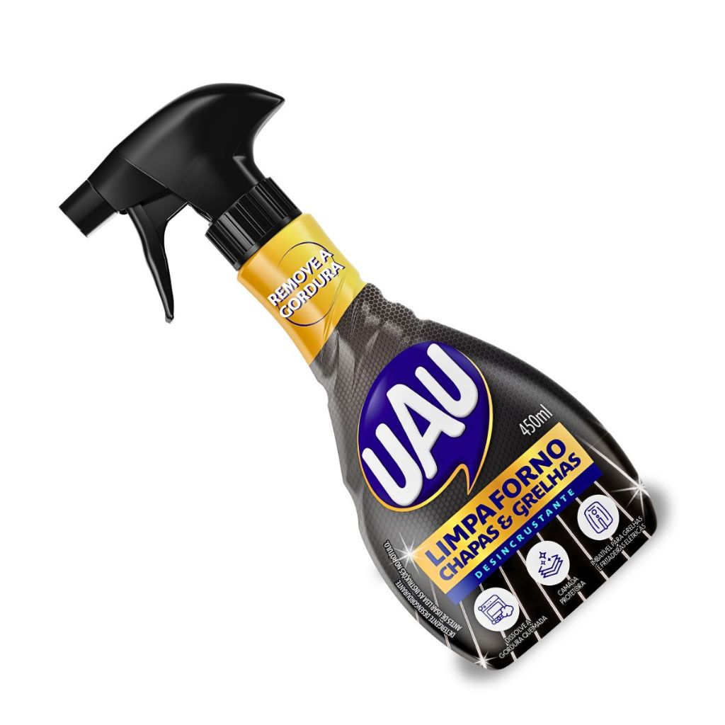 Limpa Forno Em Spray 450ml Uau SUA COZINHA AINDA MAIS LIMPA! O Limpa Forno é ideal para quem gosta de manter tudo limpo e livre de gordura, pois com este produto você terá a facilidade de limpar seus eletrodomésticos sem a necessidade de se esforçar tanto. Poderoso desincrustante formulado para remover óleos e gorduras de fornos, chapas e grelhas de ferro. Limpa sem esforço, com eficiência e seu uso frequente evita a formação de incrustações que podem danificar os equipamentos e contaminar os alimentos. Se necessário, em caso de excesso de gordura, repita a operação, procedendo da mesma forma. ------------------------------------------------------------------------------------------- ESPECIFICAÇÕES: Marca: Uau Modelo: Limpa Forno Volume: 450ml BENEFÍCIOS: Poderoso desincrustante formulado para remover óleos e gorduras de fornos, chapas e grelhas de ferro. Limpa sem esforço e com eficiência. Seu uso frequente evita a formação de incrustações que podem danificar os equipamentos e contaminar os alimentos. MODO DE USAR: Agite antes de usar. Para abrir, gire o bico do gatilho para a posição ON. Pressione o gatilho na direção da superfície a ser limpa. Aplique o produto e espere agir de 5 a 10 minutos. Em seguida, esfregue com uma esponja e retire o excesso com uma flanela úmida. ATENÇÃO: *Não aplicar em superfície aquecida. *Não aplicar em inox, superfície cromada, pintada, forno, micro-ondas, molduras e partes externas de fogões. *Recomenda-se o uso de luvas para proteção das mãos. O QUE VEM INCLUSO? 1 Limpa Forno Em Spray 450ml Uau