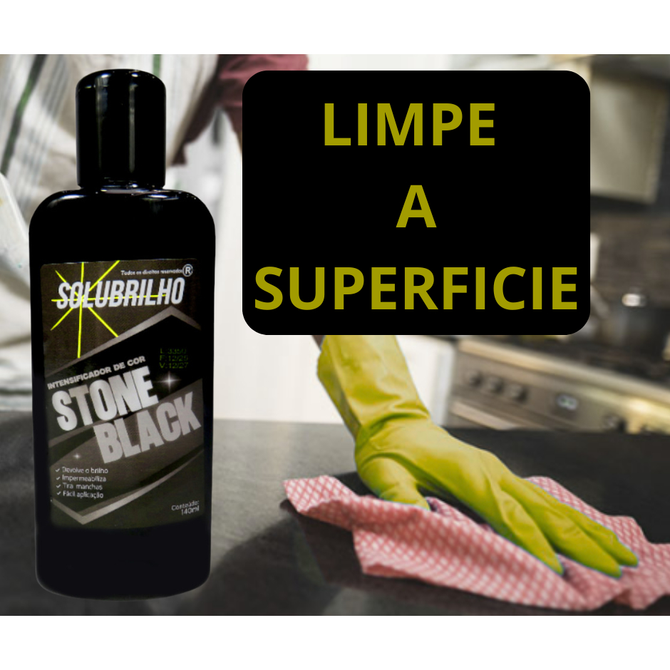 SOLUBRILHO STONE BLACK devolve a beleza das suas pedras de cor escura com um toque especial de proteção e requinte. - FACILITA A LIMPEZA; - BRILHO INTENSO E DURADOURO; - PROTEÇÃO DA SUPERFICIE CONTRA SUJIDADES; - FÁCIL DE USAR; Deixe suas pedras perfeitas com SOLUBRILHO STONE BLACK! 1 – Limpe a superfície; 2 – Aguarde secar totalmente; 3 – Espalhe o SOLUBRILHO STONE BLACK de maneira uniforme e deixe agir por alguns minutos; 4 – Remova o excesso; PRONTO! AGORA É SÓ CURTIR A BELEZA DO SEU AMBIENTE E RECEBER ELOGIOS!