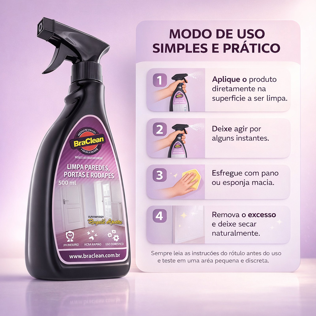 O Limpa Paredes, Portas e Rodapés 500ml BraClean foi desenvolvido para auxiliar na limpeza de superfícies internas residenciais e comerciais. Indicado para remoção de sujeiras leves, marcas de mãos, poeira acumulada e resíduos comuns do dia a dia. Ideal para quem busca produto para limpeza de paredes pintadas, portas, rodapés e acabamentos, contribuindo para manter os ambientes com aspecto limpo e conservado quando utilizado conforme orientação. BENEFÍCIOS • Auxilia na limpeza de paredes e portas. • Contribui para remover marcas e sujeiras leves. • Indicado para rodapés e acabamentos internos. • Aplicação prática com frasco de 500ml. • Uso doméstico e profissional. • Pode ser utilizado em manutenção regular. INFORMAÇÕES TÉCNICAS Marca: BraClean Produto: Limpa Paredes, Portas e Rodapés Volume: 500ml Categoria: Limpador multiuso para superfícies internas Aplicação: Paredes pintadas, portas e rodapés Estado físico: Líquido Uso: Doméstico e comercial Conteúdo da embalagem: 1 frasco de 500ml COMO USAR Agite antes da aplicação. Aplique em pano limpo ou esponja macia. Espalhe na superfície desejada. Remova excesso com pano seco. Realize teste prévio em área discreta. PERGUNTAS FREQUENTES Pode usar em qualquer tipo de tinta? Recomenda-se teste prévio para evitar danos. Remove manchas profundas? Indicado para sujeiras leves e manutenção. Pode usar diariamente? Sim, conforme necessidade e orientação. PROVA DE CONFIANÇA • Produto da linha de limpeza BraClean. • Indicado para conservação de ambientes internos. • Embalagem prática para uso regular.
