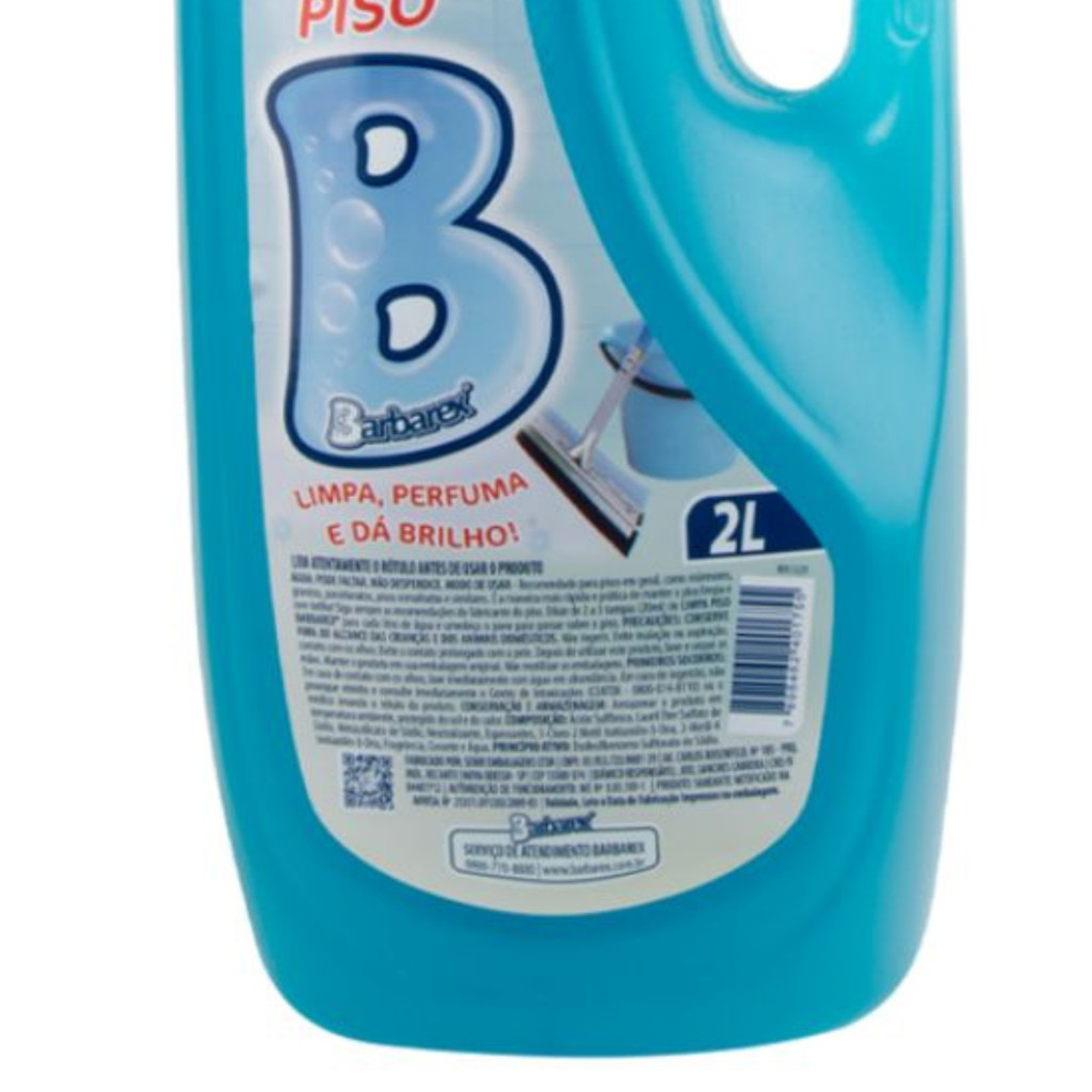Limpa Piso Barbarex 2L – Limpeza, Perfume e Brilho O Limpa Piso Barbarex 2L é ideal para a limpeza eficiente de diversos tipos de pisos. Sua fórmula especial remove sujeiras com facilidade, perfuma o ambiente e ainda proporciona brilho, deixando sua casa com sensação de frescor e limpeza por mais tempo. Indicado para uso diário, combina rendimento e qualidade em um só produto. Conteúdo: 2 litros Limpa, perfuma e dá brilho Ideal para pisos frios, cerâmicas, porcelanatos e superfícies laváveis Fácil de aplicar e de enxaguar Alta performance no rendimento Modo de uso: Dilua em água conforme indicação no rótulo e aplique com pano ou rodo. Pode ser usado puro em sujeiras mais difíceis. Precauções: Mantenha fora do alcance de crianças e animais domésticos. Não ingerir. Detalhes do Produto: Embalagem: 2 litros
