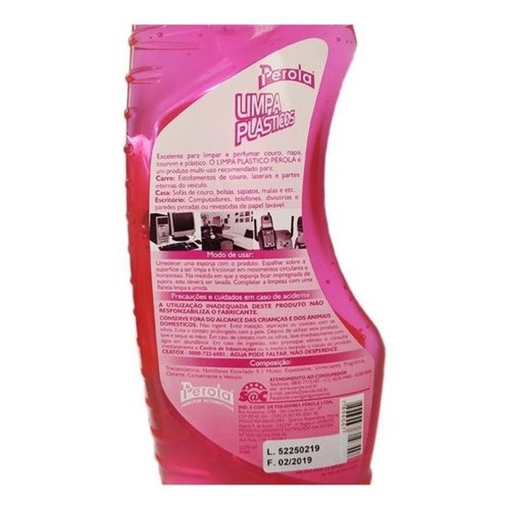 LIMPA PLÁSTICOS GEL PÉROLA Limpa Plásticos Pérola é um produto multiuso recomendado para couro, napa, courvin e plásticos. Excelente para computadores, telefones, divisórias e paredes pintadas ou revestidas de papel lavável. Limpa, perfuma e trata a superfície. DICA DE USO: De fácil aplicação, basta umedecer uma esponja com o produto e aplicar sobre a superfície a ser limpa, com movimentos circulares e horizontais. Quando a esponja ficar suja, lavá-la e voltar a repetir o procedimento até alcançar o resultado esperado. Complete a limpeza com uma flanela limpa e úmida.