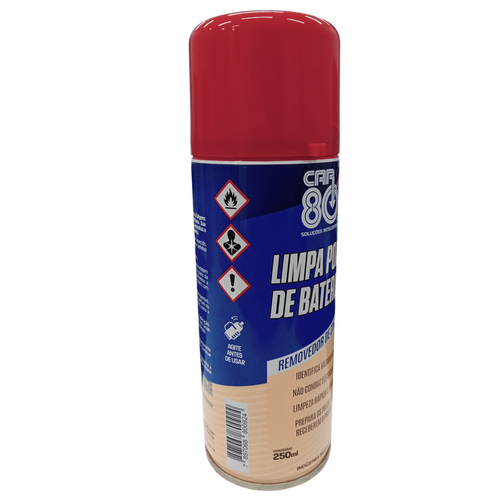 Limpa Polos de Baterias Removedor de Zinabre 250ml - 235g Código: CAR80LP CAR 80 LIMPA POLOS DE BATERIAS foi desenvolvido especialmente para remover sujeiras, fuligens e zinabre, este produto conta com uma fórmula exclusiva que proporciona uma limpeza eficiente e abrangente. Sua fórmula inovadora gera uma espuma ativa que, além de indicar possíveis vazamentos de ácidos, neutraliza a corrosão de forma eficaz. Isso garante a remoção completa de todas as impurezas acumuladas, assegurando não apenas a limpeza, mas também a longevidade e o desempenho ideal da bateria.