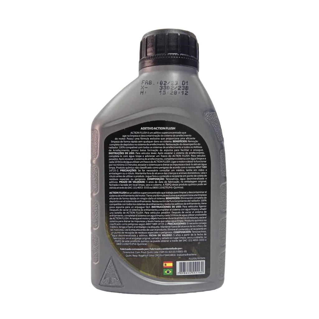 Limpa Radiador Action Flush 500ml - Tirreno ACTION FLUSH é um aditivo superconcentrado que age na limpeza e descontaminação do sistema de arrefecimento do motor. Possui uma fórmula exclusiva que proporciona uma eficiente limpeza de forma rápida sem qualquer dano ao sistema. BENEFÍCIOS: Remoção completa de depósitos no sistema de arrefecimento. Restauração do desempenho do radiador. 100% compatível com todos os sistemas de arrefecimento e todos os Aditivos de Arrefecimento, possui baixa formação de espuma para facilitar o enxague. INSTRUÇÕES DE USO: Para veículos leves: completar o sistema com água limpa e adicionar um frasco do ACTION FLUSH. Para veículos pesados: completar o sistema com água limpa e a cada 10 litros de água utilizar um frasco do ACTION FLUSH. Ligar o motor e deixá-lo funcionar por no mínimo 15 minutos, esvaziar o sistema para drenar as impurezas e lavá-lo até sair água limpa.