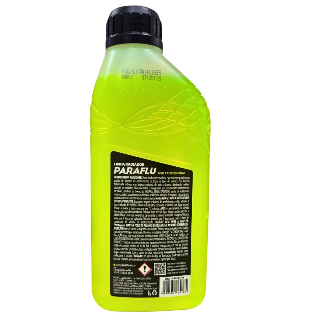 Limpa Radiador Paraflu 500 Ml Limpeza De Arrefecimento **** PEÇA NOVA ********* GARANTIA E NOTA FISCAL ***** PARAFLU LIMPA RADIADORES é um produto desenvolvido especialmente para a limpeza pesada de sistemas de arrefecimento de todos os tipos de motores. Sua fórmula balanceada proporciona uma limpeza profunda de todo o sistema, eliminando resíduos aderidos no radiador, bloco do motor e mangueiras, sem comprometer componentes metálicos, plásticos ou de borracha. PARAFLU LIMPA RADIADORES auxilia na restauração e maximiza a troca térmica ao eliminar resíduos de oxidação (ferrugem), contaminações e outras sujidades no sistema de arrefecimento. Modo de usar: NUNCA MISTURE COM OUTROS PRODUTOS. Enxágue e esvazie o sistema de arrefecimento. Em seguida, adicione a dose indicada de PARAFLU LIMPA RADIADORES e complete o sistema com água potável. Acione o motor e deixe-o operando por 15 minutos após o acionamento da válvula termostática ou eletroventilador. Enxágue bem até que a água saia limpa e então adicione o aditivo PARAFLU de sua preferência para manter o sistema protegido. Dosagem: Veículos leves: use 1 frasco por aplicação. Veículos pesados: use 1 frasco para cada 10 litros de capacidade do sistema de arrefecimento. ENXÁGUE BEM APÓS A LIMPEZA. Precauções: MANTER FORA DO ALCANCE DE CRIANÇAS E ANIMAIS DOMÉSTICOS. ATENÇÃO! Pode ser nocivo se ingerido e/ou inalado. Provoca irritação à pele. Lave as partes expostas cuidadosamente após o manuseio. Use luvas e roupas de proteção. EM CASO DE INGESTÃO/INALAÇÃO e/ou mal-estar: Contate imediatamente a PRÓ-QUÍMICA ou um médico. EM CASO DE CONTATO COM A PELE: Lave com água em abundância. EM CASO DE CONTATO COM OS OLHOS: Enxágue cuidadosamente com água durante vários minutos. Se estiver usando lentes de contato, remova-as, se for fácil, e continue enxaguando. Em caso de irritação cutânea: consulte um médico. Se a irritação ocular persistir: consulte um médico. Retire a roupa contaminada e lave-a antes de usá-la novamente. Composição: Veículo, ativo surfactante e corante. Validade: 2 anos a partir da data de fabricação, desde que mantido fechado e lacrado, armazenado em local seco, ventilado e protegido do sol. MRA