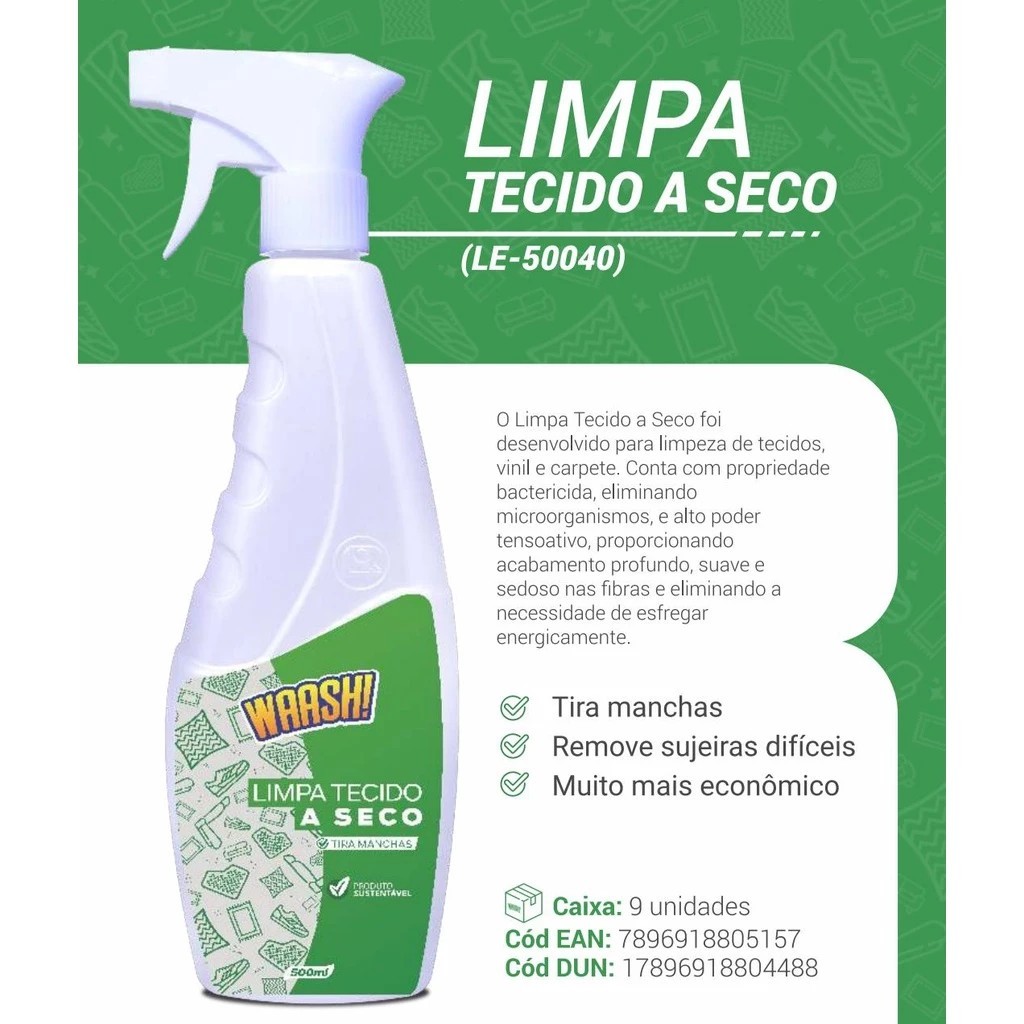 Ref: LE-50040 Características: Volume: 500 ml Validade: 2 anos Embalagem: Frasco borrifador com válvula spray Tipos de Uso: Automotivo Limpeza Uso Geral Descrição: O LIMPA ESTOFADOS LE-50040 foi desenvolvido especialmente para lavagem a seco de assentos de vinil, couro, tecido e carpetes. Proporciona uma limpeza mais profunda, devido à sua propriedade bactericida, eliminando microrganismos dos bancos do veículo. Contém tensoativos biodegradáveis e pH neutro. Seu alto poder tensoativo produz um efeito de sucção sobre as superfícies dos Estofados e Carpetes, proporcionando um acabamento profundo suave e sedoso as fibras, eliminando a necessidade de esfregar energicamente. MODO DE USAR: Na limpeza de estofados, tecidos, vinil e carpete, aplique o produto de maneira uniforme na superfície desejada, deixe agir por alguns instantes, esfregue levemente com uma escova macia e faça sua remoção antes que seque totalmente utilizando um tecido limpo e seco. Obs.: Se a sujeira persistir, repita a operação novamente.