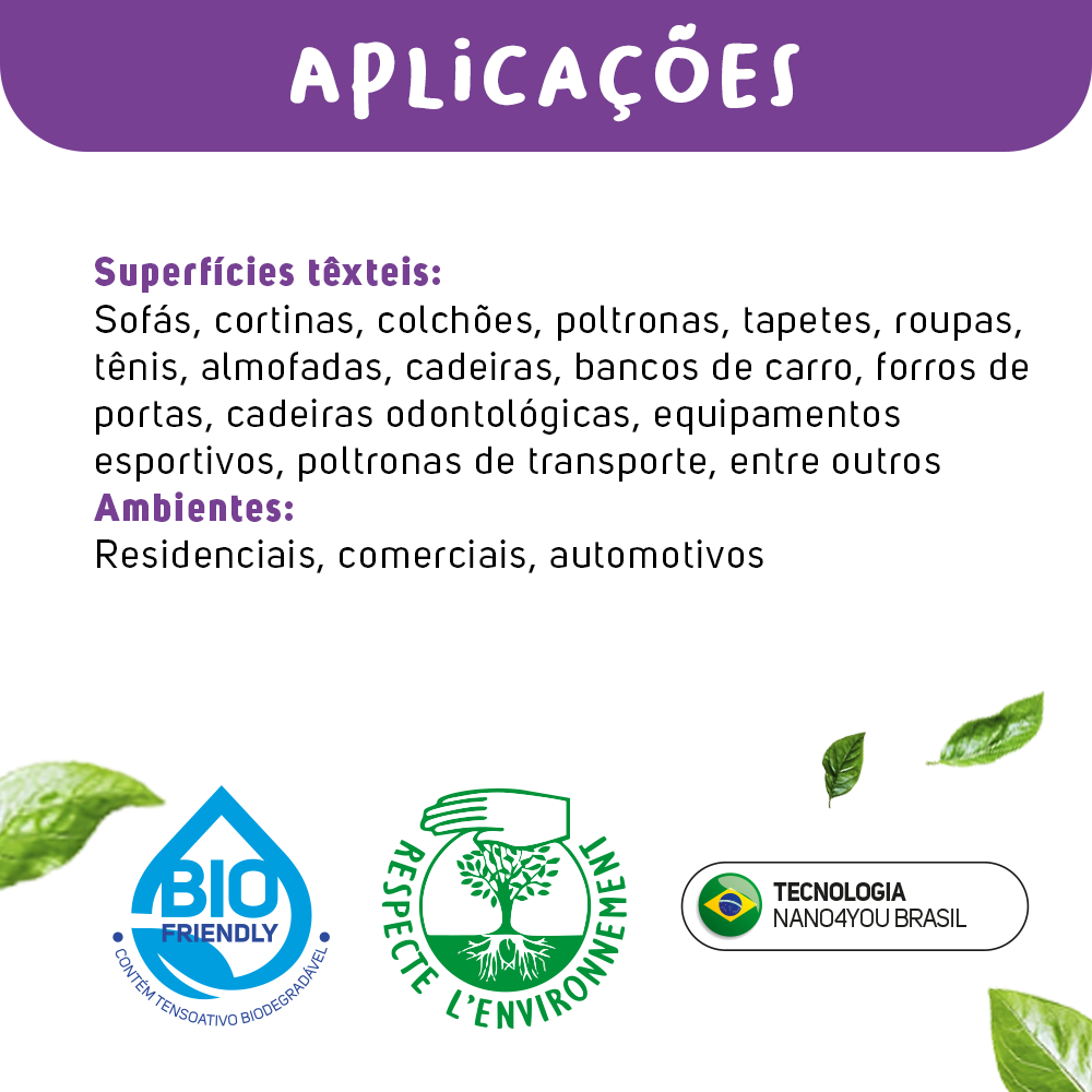 Limpa Têxtil 60ml | Cuidado e frescor em cada fibra Quer testar a eficiência da nano4you antes de apostar na versão maior? Ou precisa de uma limpeza rápida, prática e segura para tecidos fora de casa? O Limpa Têxtil 60ml é a escolha ideal para quem busca praticidade sem abrir mão de desempenho. Compacto, mas poderoso, ele remove manchas leves, odores e sujeiras do dia a dia com total segurança para tecidos sintéticos e naturais. Indicado para sofás, almofadas, roupas, bancos de carro, carrinhos de bebê e muito mais. Um verdadeiro aliado para manter tudo limpo, perfumado e bem cuidado – mesmo nas rotinas mais corridas. ---------------------------------------------------------------------------------------------------------------------------------- Benefícios * Elimina odores e sujeiras superficiais sem agredir os tecidos * Fórmula com pH equilibrado e ingredientes biodegradáveis * Seguro para uso em ambientes com pets e crianças * Ideal para testar o produto ou levar em viagens * Perfuma suavemente e revitaliza a aparência dos tecidos * Ótima opção de brinde funcional com apelo ecológico ---------------------------------------------------------------------------------------------------------------------------------- Aplicações * Estofados e almofadas * Roupas e tecidos de uso diário * Carrinhos de bebê, cadeiras e assentos infantis * Bancos automotivos * Tapetes, cortinas e tecidos decorativos ---------------------------------------------------------------------------------------------------------------------------------- Modo de uso 1. Agite bem o frasco antes de usar. 2. Pulverize diretamente sobre a superfície a ser limpa. 3. Espalhe com pano limpo ou escova de cerdas macias. 4. Deixe secar naturalmente. 5. Em casos de sujeira mais intensa, repita o processo. ---------------------------------------------------------------------------------------------------------------------------------- Características do produto * Produto pronto para uso * Compatível com fibras naturais e sintéticas * Fragrância suave * Sem cloro, corantes agressivos ou componentes abrasivos * Não mancha, não engordura e não altera a textura ---------------------------------------------------------------------------------------------------------------------------------- Especificações técnicas * Nome: Limpa Têxtil Tecidos e Tapetes * Volume: 60ml * Tipo de uso: Pronto para uso * Linha: nano4you HOME * Tecnologia: Nanotecnologia aplicada à limpeza de tecidos * Origem: Brasil * Validade: 12 meses (embalagem lacrada e armazenada corretamente) ---------------------------------------------------------------------------------------------------------------------------------- nano4you – More time for life.