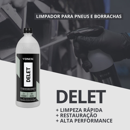 Delet é um limpador de alta performance, formulado exclusivamente para remover sujidade severa em pneus e borrachas, garantindo total limpeza, desenvolvendo originalidade e sem deixar aspecto acinzentado. Essa limpeza ajudará a melhorar a performance dos produtos para condicionar os pneus. Precauções: Cuidado! Perigosa sua ingestão. Pode provocar danos ao sistema respiratório por exposição repetida ou prolongada. Conserve fora do alcance das crianças e animais domésticos. Evite contato prolongado com a pele, Lavar as mãos após o uso. Em caso de contato com os olhos, lavar com água corrente em abundância durante 15 minutos. Se inalado em excesso, remover a pessoa para local bem ventilado. Se ingerido, não provocar vômito e consultar de imediato Centro de Intoxicações ou Serviço de Saúde mais próximo, portando a embalagem ou rótulo do produto. Ceatox 0800 722 6001 manter o produto na embalagem original. Proteger o produto do sol e do calor. Não reutilizar a embalagem vazia para outra finalidade. Tamanho: 1,5L Modo de uso: 1- Com o pneu ainda seco, pulverizar a espuma do produto em todo pneu. 2- Deixar o produto agir de 30 a 60 segundos, ou até observar uma mudança de coloração da espuma de branco para cinza, marrom ou preto. Essa mudança de coloração é um indicador de presença de muita impregnação de sujeira. 3- Fazer a esfregação por completo, utilize uma escova para limpeza de pneus. 4- Fazer o enxágue com um jato d'água. 5- Se necessário repita a operação.