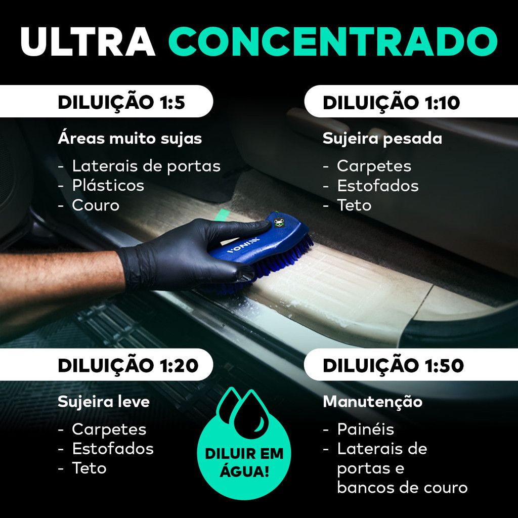 Bem-vindo a Koala Parts! A sua escolha certa para peças e acessórios automotivos - Há mais de 10 anos oferecendo qualidade e confiança. Limpador Bactericida Auto Interior Sintra Pro 5L Vonixx • LIMPADOR MULTIUSO • BACTERICIDA • ULTRA CONCENTRADO • LIMPA SEM AGREDIR AÇÃO BACTERICIDA Elimina vírus e bactérias de forma eficiente e segura. ELIMINA MAUS ODORES Combate os odores desagradáveis e deixa o veículo com aroma fresco e agradável. COM pH BALANCEADO Formulado com agentes que não danificam as superfícies do veículo. RENDIMENTO EXCEPCIONAL COM FÓRMULA SUPER CONCENTRADA - Diluição 1:5: Limpeza de áreas muito sujas (laterais de portas, plásticos e couro) - Diluição 1:10: Sujeira Pesada (carpetes, estofados e limpeza de teto) - Diluição 1:20: Sujeira leve (carpetes, estofados e limpeza de teto) - Diluição 1:50: Manutenção de limpeza interna (painéis, laterais de portas e bancos de couro) *Em extratoras com diluição de até 1:60 e em tornador com diluição 1:10. USO RECOMENDADO Painéis Couro Carpetes Estofados Teto **Não recomendado a aplicação em vidros automotivos. APLICAÇÃO Pulverizar o produto já diluído na superfície a ser limpa e desinfetada utilizando um pincel, escova macia ou aplicador de espuma. Remover o excesso com auxílio de uma toalha de microfibra úmida, e secar em seguida com uma toalha seca. ESPECIFICAÇÕES TÉCNICAS: - Disponível em: 5L - Diluição: Concentrado - Estado Físico: Líquido - Cor do produto: Verde - Solubilidade em Água: Solúvel - pH do produto: Entre 12,0 e 13,0 CONTEÚDO DA EMBALAGEM - 01 Limpador para interior de Veículos Sintra Pro 5L Vonixx