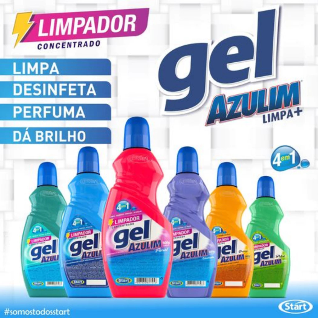 Limpador Gel Azulim é um desinfetante gelatinoso com alto poder bactericida. Características - Garante excelentes resultados na limpeza e desinfecção de banheiros, áreas de serviço, quintais, locais usados por animais de estimação, fibras têxteis, pisos sintéticos (paviflex e decorflex) e superfícies laváveis em geral; - Ação bactericida frente às cepas de Salmonella choleraesuis, Staphylococcus aureus, Pseudomonas aeruginosa; - Produto biodegradável. Modo de Usar - Puro: Para desinfecção de vasos sanitários, ralos e latas de lixo aplique Limpador Gel Azulim diretamente sobre a superfície a ser desinfetada e deixe agir por 10 minutos. - Diluído: Para limpeza dilua 1 parte de Limpador Gel Azulim em até 50 partes de água, de acordo com o teor de sujidade a ser removido. Importante É recomendável o uso de luvas ao manusear o produto e suas diluições. Conservação e Armazenagem Mantenha o produto em sua embalagem original, ao abrigo de luz e bem fechada após o uso. Não reutilize a embalagem vazia para outros fins.