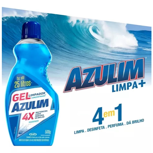 Limpador Gel Concentrado Azulim 4em1 500g Mariner - Rende 25L | Desinfetante Bactericida Biodegradável 📝 Descrição Otimizada (Focada em Escaneabilidade) Buscando eficiência MÁXIMA e economia na limpeza? O Limpador Concentrado Gel Azulim 4em1 é a sua solução definitiva. Com apenas 500g, você faz até 25 LITROS de um limpador poderoso. Isso mesmo! Ele limpa, desinfeta, perfuma e dá brilho, tudo com um único produto. Sua fórmula em gel concentrado garante um poder bactericida superior, eliminando germes e bactérias para um ambiente verdadeiramente limpo e seguro. ✨ 5 Benefícios que Resolvem sua Limpeza 1. Economia Insuperável: Rende até 25 litros! Um frasco de 500g substitui dezenas de outros produtos, oferecendo o melhor custo-benefício. 2. Ação 4 em 1 Completa: Limpa profundamente, desinfeta (mata germes!), perfuma com a fragrância Mariner duradoura e devolve o brilho natural das superfícies. 3. Super Versátil: Perfeito para todos os ambientes! Use em banheiros, cozinhas, áreas de serviço, quintais, pisos sintéticos (Paviflex/Decorflex) e até para limpeza de locais com animais de estimação. 4. Proteção para o Planeta: Este produto é biodegradável, permitindo que você limpe sua casa sem sujar o meio ambiente. 5. Aroma que Fica: Deixa um agradável e duradouro aroma de limpeza Mariner, mantendo a sensação de frescor por muito mais tempo. 📍 Onde Usar? Vasos sanitários, ralos e lixeiras (use puro para desinfecção) Banheiros e Pias Áreas de Serviço e Quintais Pisos sintéticos (Paviflex e Decorflex) Locais de animais de estimação Fibras têxteis e superfícies laváveis em geral 💡 Como Usar (Para Render ao Máximo) Para Desinfecção (Uso Puro): Aplique diretamente em vasos sanitários, ralos ou lixeiras. Deixe agir por 10 minutos. Para Limpeza Geral (Uso Diluído): Dilua o produto em água. A embalagem de 500g pode ser diluída em até 25 litros de água, dependendo da necessidade da limpeza. 📦 O que você vai receber: 1 Frasco de Limpador Concentrado Gel Azulim 4em1 500g Fragrância: Mariner Produto Biodegradável Garanta já a limpeza mais eficiente e econômica para sua casa ou empresa!