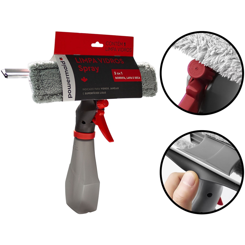 Limpador De Vidros Spray Microfibra 3 Em 1 Com Borrifador 240ml Limpa Seca Vidros Janelas Powermaid