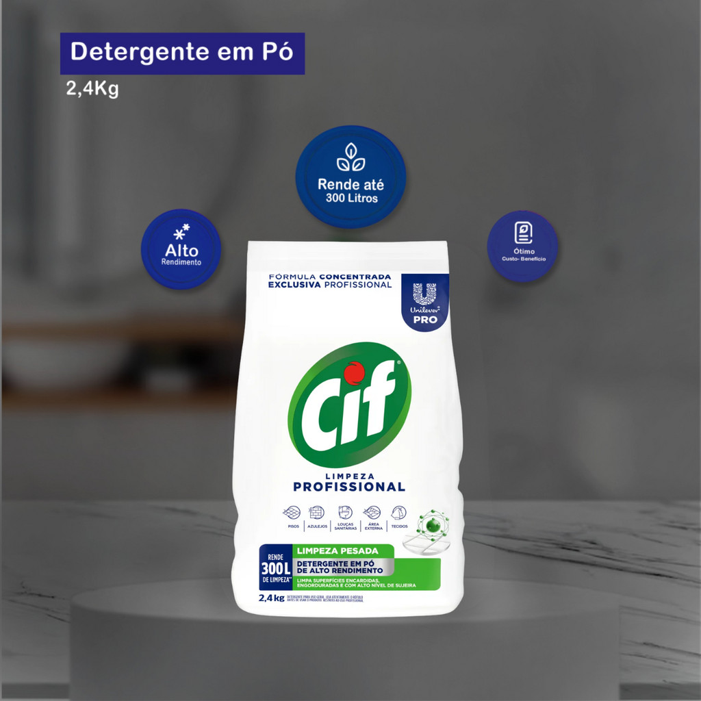 Limpador em Pó Limpeza Profissional 2,4kg Cif Este poderoso detergente em pó é especialmente formulado para remover sujeiras difíceis, manchas persistentes e gordura acumulada em diversas superfícies. Uma embalagem de 2,4 kg rende até 300L de solução de limpeza, representando excelente custo-benefício para uso doméstico e profissional. Indicação de Uso: - Ideal para uso doméstico e profissional na limpeza de pisos, azulejos, bancadas, louças sanitárias, têxteis e áreas externas. Diluição: - Limpeza diária: Dissolva 80g do produto em 30L de água; - Limpeza pesada: Dissolva 240g do produto em 30L de água; - Lavagem de Tecidos: 25g do produto por kg de roupa seca (sujeira moderada); 35g do produto por kg de roupa seca (sujeira extrema). Modo de Uso: - Limpeza de superfícies: Evite o uso direto em superfícies de mármore e granilite, pois pode apresentar manchas devido ao desgaste químico, utilize a parte menos abrasiva da esponja/utensílio, utilizar apenas em superfícies laváveis; - Lavagem de roupas: Não aplique diretamente sobre os tecidos, o produto deve estar totalmente dissolvido antes de iniciar a lavagem. Não misture produtos á base de cloro, o tempo ideal de molho é de até 2 horas. Evite deixar tecidos de tons pastel de molho. lave com bastante água corrente objetos e utensílios usados como medida antes de reutilizá-los. Embalagem: 01 pacote de 2,4kg