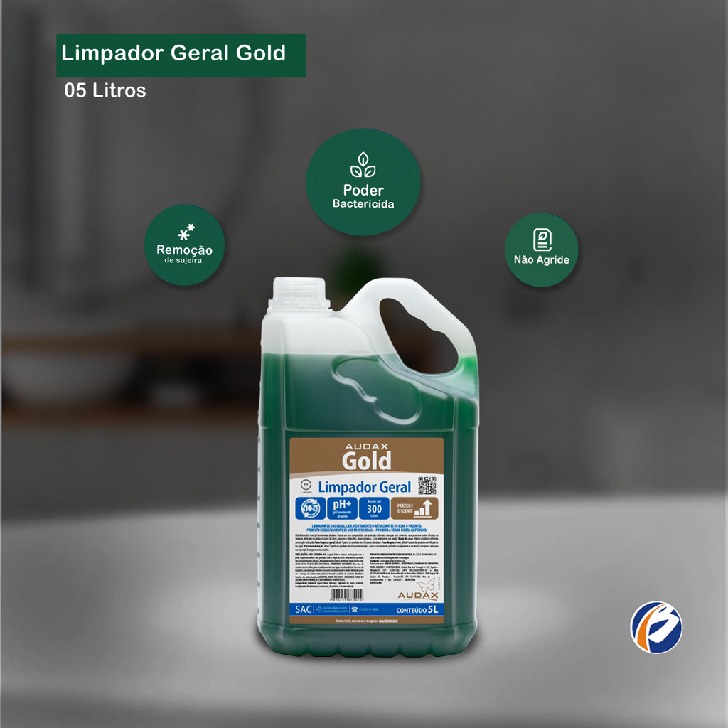 Limpador Geral 5L Gold Multilimpador com ótimo desempenho e pH levemente alcalinos. Possui, em sua composição, um princípio ativo em sinergia com solvente, que promovem maior eficácia na limpeza. Indicação de Uso: - Indicado na limpeza geral de pisos, paredes e utensílios, áreas externas, e ambientes em geral. Diluições: - Limpeza geral: Diluir 01 parte do produto em 20 partes de água; - Limpeza leve: Diluir 01 parte do produto em 40 partes de água; - Para Manutenção: Diluir 01 parte do produto em 60 partes de água. Embalagem: 01 Galão de 5L