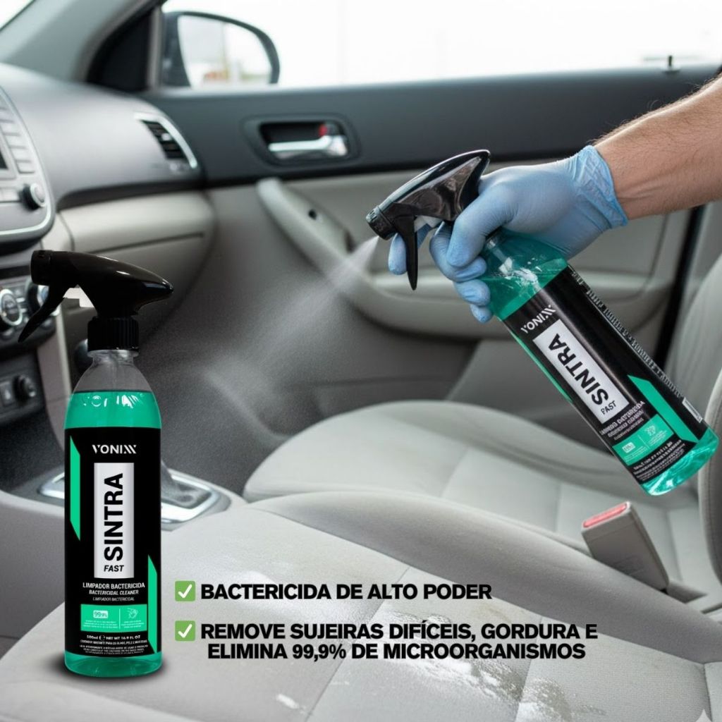 Sintra Fast Vonixx 500ml – Limpeza Interna e Proteção Bactericida Mantenha o interior do seu veículo impecável com o Sintra Fast, o multilimpador flotador de pH equilibrado da Vonixx. Desenvolvido para quem entende que cuidar do carro vai além da estética: é sobre garantir a durabilidade dos materiais e a saúde de quem está a bordo. No dia a dia, as superfícies internas enfrentam o desgaste do tempo e a proliferação de microrganismos. O Sintra Fast permite que o seu estofado, painel e laterais de porta sobrevivam às agressões externas e ao uso severo, eliminando sujeiras profundas e combatendo bactérias e germes. Mais do que apenas limpar, este produto faz o seu veículo prosperar: renova o aspecto original das superfícies, devolve o conforto do ambiente interno e valoriza o seu patrimônio com um acabamento de alto padrão. Por que o SINTRA FAST é essencial? • Ação Bactericida: Elimina microrganismos, garantindo um ambiente mais seguro. • Limpeza de Alta Performance: Remove manchas de gordura, suor e sujeiras encrustadas. • Segurança Total: pH equilibrado que não agride plásticos, couros, tecidos ou borrachas. • Pronto para Uso: Fórmula "Fast" (rápida), não precisa de diluição. • Versatilidade: Ideal para painéis, laterais de porta, teto e estofados (couro ou tecido). Onde aplicar: • Painéis e consoles plásticos. • Bancos de tecido e couro. • Forros de porta e carpetes. • Qualquer superfície interna que exija higienização profunda e segura. Modo de Uso Simples: 1. Aplique: Borrife o produto diretamente na superfície ou em um aplicador de espuma/microfibra. 2. Agite: Utilize uma escova macia ou pincel de detalhamento para desprender a sujeira. 3. Remova: Utilize uma microfibra limpa para retirar o excesso. 4. Finalize: Passe uma microfibra seca para um acabamento perfeito. Resultado: Interior higienizado, livre de odores e bactérias, com a preservação original que o seu carro merece. Dê ao seu carro o tratamento de elite que ele merece. Compre agora o Sintra Fast da Vonixx!