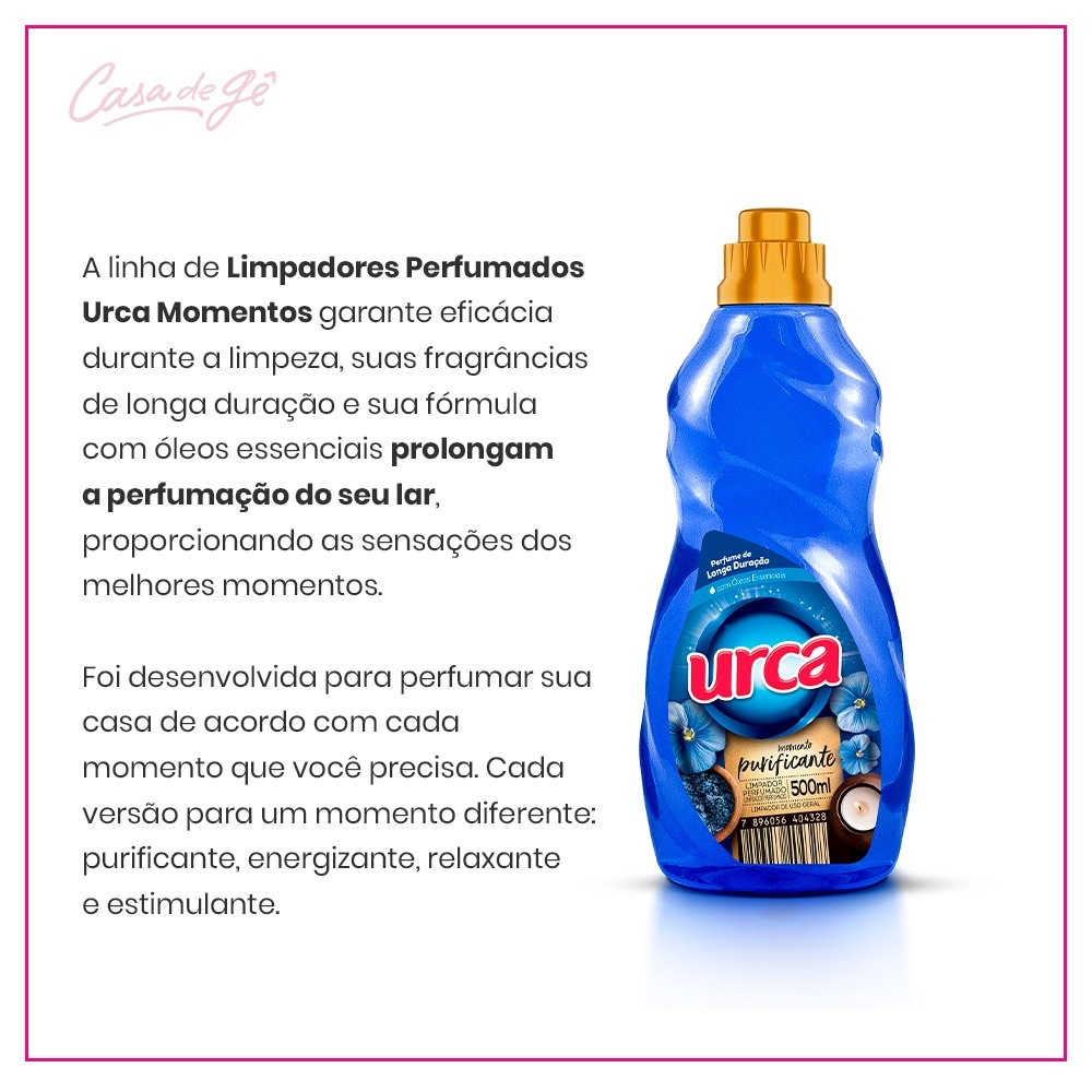 Desenvolvido com óleos essenciais e com perfume de longa duração, o Limpador Perfumado Momento Purificante ajuda você a manter a sua casa mais limpa e perfumada. Descrição Média OS LIMPADORES PERFUMADOS URCA POSSUEM PERFUME DE LONGA DURAÇÃO, ELABORADOS COM ÓLEOS ESSENCIAIS QUE LIMPAM E PERFUMAM O AMBIENTE, É IDEAL PARA TODA A CASA. ÓTIMA RELAÇÃO CUSTO x BENEFÍCIO Descrição Longa Limpar é só metade da questão. Deixar sua casa com um aroma inesquecível é a outra metade! Momentos é a nova linha de limpadores de Urca que auxilia você na limpeza geral da casa, com uma seleção de fragrâncias de acordo com o momento que você precisa. Traga mais harmonia e equilíbrio para o seu lar! Com óleos essenciais e perfume prolongado, o Limpador Perfumado Momento Purificante ajuda você a manter a sua casa mais limpa e perfumada. Composição: Lauril Eter Sulfato de Sódio, Coadjuvante, Acidificante, Sequestrante, Fragrância, Conservante, Corantes e Água. Modo de usar: LIMPEZA PESADA: Aplique o produto puro com um pano úmido. Após aplicar é necessário enxaguar nem enxugar. LIMPEZA GERAL: Dilua 3 ½ tampas do produto em 3 litros de água. Umedeça o pano e aplique sobre as superfícies a serem limpas. PARA SUJEIRAS MAIS DIFICIES: Aplicar o produto puro com um pano úmido. Não é necessário enxaguar. PARA MELHOR FIXAÇÃO DO PERFUME OU PARA PERFUMAÇÃO PROLONGADA, RECOMENDA-SE-USAR O PRODUTO PURO.