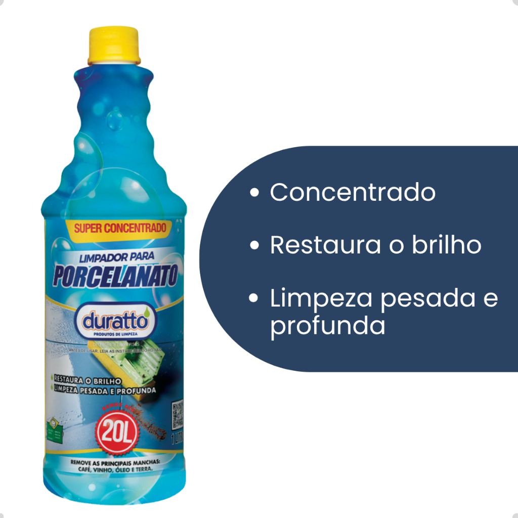 Limpa Porcelanato Super Concentrado 1L – Alta Performance e Brilho Duradouro O Limpa Porcelanato Super Concentrado foi desenvolvido para proporcionar uma limpeza profunda e eficaz, sem deixar o piso embaçado 🧼. Ideal para quem busca praticidade, alto rendimento e a manutenção do brilho original do porcelanato CARACTERÍSTICAS DO PRODUTO: • Limpa porcelanato sem deixar resíduos nem aspecto embaçado • Remove com facilidade manchas de café, vinho, óleo, terra e muito mais • Fórmula super concentrada, garantindo excelente rendimento • 1 litro de produto rende até 20 litros de solução de limpeza • Ideal para uso residencial ou comercial INDICAÇÕES DE USO: Recomendado para porcelanatos: • Polido • Esmaltado • Rústico • Gloss • HD O QUE VEM NA EMBALAGEM: • Conteúdo: 1x Litro Limpador Porcelanato Concentrado Duratto GARANTIA: • Garantia do vendedor: 90 dias Perguntas Frequentes (FAQ): * Como deve ser diluído o Limpador Porcelanato Duratto ? O Limpador Porcelanato Duratto é concentrado, portanto, deve ser diluído em água. A proporção recomendada é de 1 parte do produto para 10 partes de água para limpeza regular. Para limpeza mais pesada, pode-se aumentar a concentração. * O Limpador Porcelanato Duratto remove manchas difíceis? Sim! O Limpador Porcelanato Duratto é ideal para remover manchas difíceis, como gordura, sujeira acumulada e marcas de produtos de limpeza anteriores. Sua fórmula desengordurante faz a diferença na limpeza de superfícies engorduradas. * Como devo aplicar o Limpador Porcelanato Duratto? Dilua o produto conforme as instruções e aplique com um pano limpo, mop ou esfregão sobre a superfície do piso. Para manchas mais difíceis, aplique diretamente sobre a área afetada e esfregue suavemente. Garanta já o seu Limpa Porcelanato Super Concentrado 1L e mantenha seus pisos sempre limpos, brilhantes e renovados! ✨