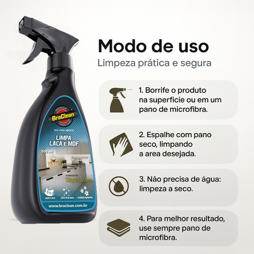 Limpa MDF e Laca Multiuso 500ml BraClean — Limpeza Profunda, Proteção e Brilho Impecável Mantenha seus móveis e superfícies sempre limpos, protegidos e com aparência de novos com o Limpa MDF e Laca Multiuso 500ml BraClean. Especialmente desenvolvido para quem não abre mão de qualidade, ele é ideal para o cuidado diário de superfícies delicadas, garantindo limpeza eficaz sem comprometer o acabamento original. Sua fórmula balanceada remove poeira, gordura leve, manchas e resíduos do dia a dia com facilidade, sem deixar marcas, manchas ou resíduos pegajosos. Além de limpar, realça o brilho natural, prolonga a durabilidade da pintura, verniz ou laca e evita o desgaste precoce do móvel. Por que escolher o Limpa MDF e Laca BraClean? Remove poeira, gordura leve e sujeiras do dia a dia sem esforço, poupando tempo e trabalho na rotina de limpeza. Não deixa resíduos pegajosos, não mancha e não agride superfícies delicadas, mantendo o acabamento original intacto. Realça o brilho natural do móvel, valorizando o ambiente e prolongando a vida útil da pintura, laca ou verniz. Fórmula balanceada para uso frequente, podendo ser utilizado diariamente sem risco de danificar as superfícies. Praticidade no uso: aplicação simples, ação rápida e resultado visível logo na primeira passada. Rendimento excelente: 500ml de produto rendem diversas aplicações, tornando a limpeza mais econômica. Tecnologia desenvolvida para unir eficiência de limpeza e segurança para quem aplica. Ideal para: Móveis de MDF laqueados que exigem cuidado especial para evitar riscos e manchas. Portas, armários, painéis decorativos e superfícies pintadas em geral. Ambientes residenciais e corporativos como escritórios, salas, quartos e recepções, onde limpeza de qualidade faz diferença na aparência e conservação. Instruções de uso: Agite antes de usar para garantir a homogeneidade da fórmula. Borrife o produto diretamente na superfície ou em um pano limpo e macio. Espalhe de forma uniforme, removendo sujeiras e poeira. Para sujeiras mais persistentes, aplique novamente e deixe agir por alguns segundos antes de passar o pano. Finalize com um pano seco de microfibra para garantir acabamento sem marcas e realçar o brilho natural da superfície. Recomenda-se realizar um teste prévio em uma área pequena e pouco visível para verificar compatibilidade. Informações técnicas: Conteúdo: 500ml Composição: Tensoativos especiais e fragrâncias suaves, desenvolvidos para não agredir superfícies delicadas como MDF, laca, pintura e verniz. Validade: Vide embalagem do produto. Condições de armazenamento: Manter em local fresco, seco e protegido do sol e do calor excessivo. Precauções: Mantenha fora do alcance de crianças e animais domésticos. Evite contato direto com os olhos e a pele em excesso. Em caso de contato acidental, lave com água em abundância. Aviso: Não nos responsabilizamos pelo uso incorreto do produto. Leia sempre as instruções de uso no rótulo e siga as recomendações de aplicação para garantir os melhores resultados. Com o Limpa MDF e Laca BraClean, sua casa ou escritório ganha mais brilho, proteção e elegância todos os dias, de forma prática, econômica e segura.