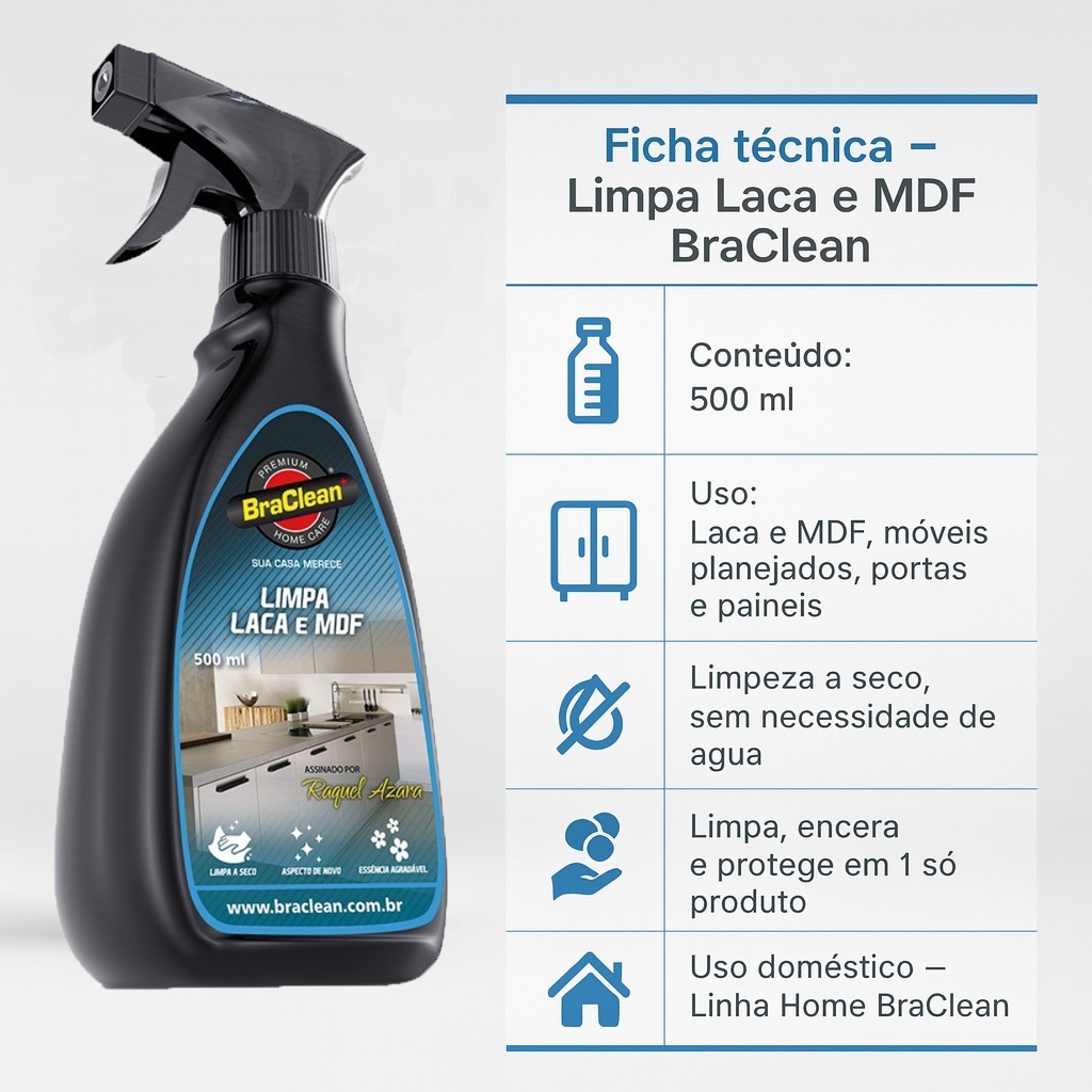 O Limpa Laca e MDF 500ml BraClean foi desenvolvido especialmente para a limpeza de superfícies em laca e MDF, como móveis planejados, portas e painéis, oferecendo higienização eficaz sem agredir o acabamento. Sua fórmula é indicada para uso doméstico em superfícies delicadas, ajudando a remover poeira, sujeiras e manchas leves do dia a dia, mantendo o aspecto natural do móvel. Além de limpar, o produto encera e forma uma camada protetora, contribuindo para manter o brilho e reduzir a aderência de novas sujeiras, o que facilita as próximas limpezas. A aplicação em spray torna o uso mais prático, com melhor distribuição, menos desperdício e sem necessidade de diluição. BENEFÍCIOS Indicado para laca e MDF, sem danificar o acabamento (quando usado conforme recomendação). Ajuda a remover poeira, sujeiras e manchas leves, deixando a superfície mais limpa e uniforme. Limpa e encera ao mesmo tempo, criando camada protetora que auxilia na manutenção do brilho. Diminui a aderência de sujeiras, facilitando a limpeza de manutenção. Ação delicada, sem riscar e sem uso de água durante a aplicação. Spray pronto para uso, com aplicação fácil e espalhamento homogêneo. Uso recomendado em ambientes internos: móveis planejados, portas e painéis em MDF e laca. INFORMAÇÕES TÉCNICAS Marca: BraClean Linha: Linha Home (uso doméstico; foco em superfícies delicadas como laca e MDF) Produto: Limpa Laca e MDF 500ml Categoria: Limpador doméstico para superfícies delicadas Tipo: Limpador que limpa e encera, formando camada protetora sobre laca e MDF Apresentação: Frasco spray com 500ml Estado físico: Líquido Indicado para: Superfícies em laca e MDF; móveis planejados; portas e painéis (ambientes internos) Ação: Limpa, auxilia na remoção de poeira/sujeiras/manchas leves, encera e contribui para manter o brilho natural Formato: Spray pronto para uso (não requer diluição) Registro Anvisa: 25351428535201820 Fabricante: Prisztech do Brasil Validade: 24 meses após a fabricação Conteúdo da embalagem: 1 frasco de Limpa Laca e MDF BraClean 500ml Composição: detalhada não divulgada em ficha pública; trata-se de saneante de uso geral, com tensoativos e aditivos adequados para limpeza de laca e MDF. COMO USAR Agite levemente o frasco antes do uso. Aplique sobre a superfície fria e seca (diretamente) ou em um pano limpo e macio. Espalhe com movimentos suaves e uniformes até cobrir a área desejada. Em sujeira mais concentrada, repita a aplicação (sempre com pano macio para não riscar). Não precisa enxaguar: deixe secar naturalmente. Após o uso, mantenha o frasco bem fechado e guarde em local fresco, seco e fora do alcance de crianças e animais. PERGUNTAS FREQUENTES (FAQ) 1) Posso usar em qualquer tipo de móvel? É indicado principalmente para laca e MDF. Em outros materiais, faça teste prévio em uma área pequena e discreta. 2) Substitui desinfetante? Não. É um limpador para superfícies delicadas e não é vendido como desinfetante/bactericida. 3) Preciso enxaguar? Não. É pronto para uso e não exige enxágue quando aplicado corretamente. 4) Pode ser usado em MDF alto brilho? Sim, desde que o acabamento seja em laca ou compatível e seja aplicado com pano macio. Em caso de dúvida, teste antes. 5) Deixa oleoso ou pegajoso? Em quantidade adequada e bem espalhado, tende a deixar brilho natural. Se houver excesso, finalize com pano seco e limpo. 6) Serve para uso profissional? O foco é uso doméstico, mas pode ser utilizado por profissionais de manutenção/limpeza de móveis planejados, respeitando as recomendações do fabricante. POR QUE COMPRAR Desenvolvido especificamente para laca e MDF, oferecendo mais segurança que limpadores genéricos. Linha Home BraClean voltada para cuidado e conservação de superfícies delicadas. Possui registro na Anvisa, além de informações claras de fabricante e validade. Spray prático, com aplicação uniforme e menor desperdício. Ideal para quem quer preservar móveis planejados e evitar produtos agressivos que possam prejudicar o acabamento com o tempo.