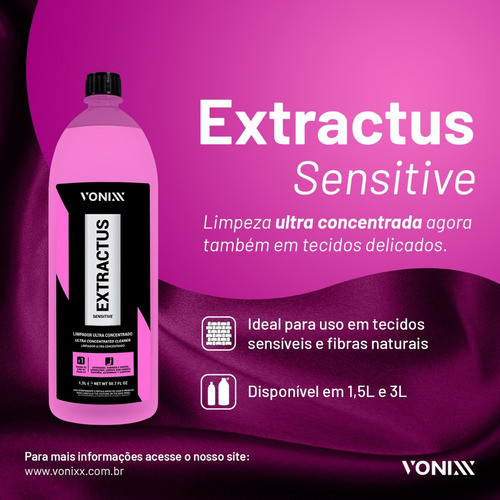 Extractus Sensitive é um limpador que todo profissional que atua com higienização de estofados precisa ter! Esse produto chegou como um complemento da linha VSC e foi desenvolvido principalmente para uso em tecidos mais delicados e de fibras naturais como seda, linho, lã e camurça, porque tem pH neutro em sua composição. Seu uso também é indicado para limpeza profissional de estofados automotivos, carpetes, sofás, colchões e tapete. Sua fórmula contém tensoativos especiais que renovem diversos tipos de sujeira nos tecidos mais sensíveis sem causar nenhum dano. Diluição: Sujeira pesada 1:10 Sujeira média 1:30 Sujeira leve 1:60 Uso recomendado: Tecidos mais finos, linho, lã e camurça -Passo 1 do sistema VSC -Limpeza de estofados, carpetes e tapetes de tecidos sensíveis Tamanho: 1,5L Modo de usar: 1. Diluir o produto na proporção ideal de acordo com o nível de sujeira 2. Pulverizar uma fina néveo do produto, mantendo distância entre 20cm a 30cm da superfície, a fim de evitar inchamento do estofado ou carpete. Aguardar 2 minutos. 3. Utilizar escova macia e realizar a esfregação para auxiliar no desprendimento da sujeira 4. Realizar a extração ou aspiração sem enxágue 5. Realizar uma segunda extração, dessa vez com enxágue