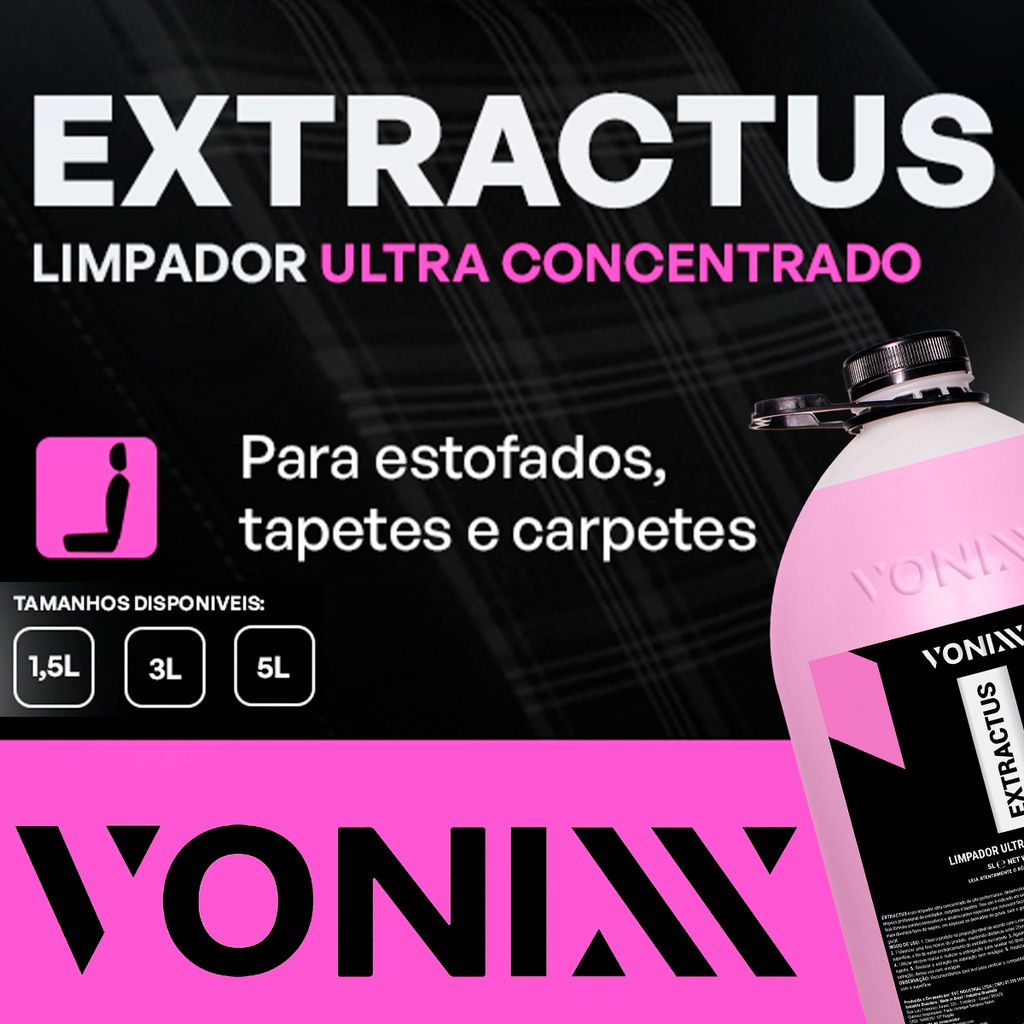 Produto Limpeza Extractus 5l Vonixx Para Limpar Banco Couro Estofados Sofá Bancos Hidrata Carro Limpar Multiação Multiuso Super Ultra Concentrado Profissional Tapetes Extratoras EXTRACTUS é um limpador ultra concentrado de alta performance e baixa espumação, desenvolvido para limpeza profissional de estofados, carpetes e tapetes. Seu uso é indicado em extratoras. Sua fórmula contém tensoativos e alcalinizantes especiais que removem facilmente os mais diversos tipos de sujeira, em especial as derivadas de graxa, suor e gorduras em geral. • pH Básico, conforme rótulo. [DILUIÇÕES] • Sujeira pesada – 1:10 • Sujeira média – 1:30 • Sujeira leve – 1:60 * A diluição poderá ser alterada para mais ou para menos a depender do resultado observado * OBSERVAÇÃO: Recomendamos spot test para verificar a compatibilidade do produto com a superfície. • Não utilizar este produto em plástico, piso de porcelanato e materiais de fibras naturais, como linho e camurça. [MODO DE USAR] • Diluir o produto na proporção ideal de acordo com o nível de sujeira. • Pulverizar uma fina névoa do produto, mantendo distância entre 20cm a 30cm da superfície, a fim de evitar encharcamento do estofado ou carpete. • Aguardar 2 minutos. • Utilizar escova macia e realizar a esfregação para auxiliar no desprendimento da sujeira. • Realizar a extração ou aspiração sem enxágue. • Realizar uma segunda extração, dessa vez com enxágue. [CONTEÚDO DA EMBALAGEM] • 1 Limpador Ultra Concentrado Extractus 5 Litros - Vonixx Por que adquirir este produto com a Loja do Som e Acessórios? • Todos os produtos à pronta entrega • Produtos de qualidade garantida • Equipe de atendimento especializada • Envio em 24 horas após o pagamento • Compra com segurança e credibilidade • No mercado há mais de 10 anos • Produtos com garantia e nota fiscal IMPORTANTE: A Loja do Som e Acessórios recomenda que a instalação seja feita por profissional especializado e não se responsabiliza pelo mau uso do produto. [DÚVIDAS FREQUENTES] • Como funciona a garantia? R: Nossos produtos têm uma etiqueta de garantia para nosso controle interno, com essa etiqueta verificamos se o produto é nosso mesmo, portanto NÃO tire a etiqueta do produto. • O produto está disponível a pronta entrega? R: Sim, todos os nossos produtos estão no nosso estoque preparado para ser embalado e enviado pra você! • Caso haja qualquer dúvida sobre o seu pedido/produto entre em seu pedido e nos envie uma mensagem, estaremos à sua disposição.