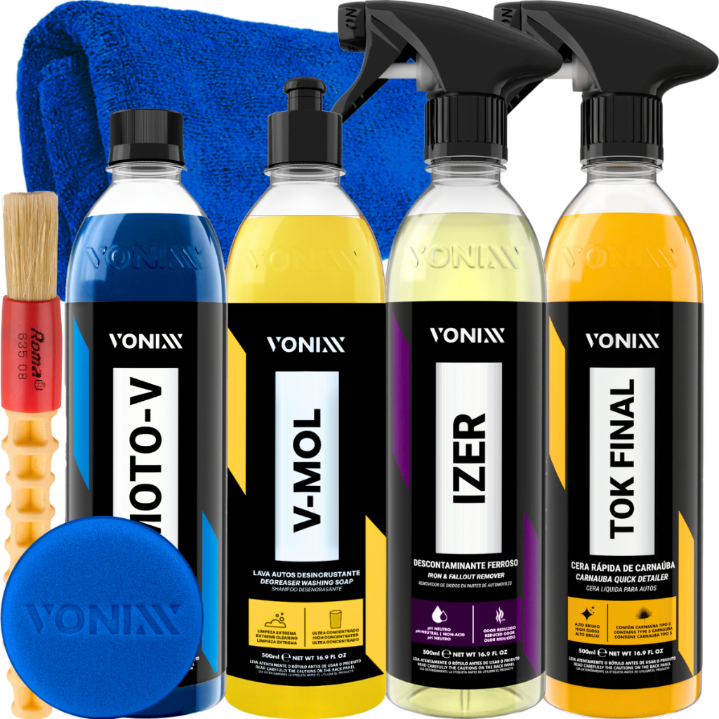 1 - TOK FINAL 500ML VONIXX 1 - V-MOL 500ML VONIXX 1 - IZER 500ML VONIXX 1 - MOTO-V 500ML VONIXX 1 - PINCEL ROMA 1 - PANO MICROFIBRA 40X40 JS 1 - APLICADOR DE ESPUMA VONIXX ------------------------------------------------------- - CARNAÚBA TOK FINAL 500ML - CERA DE MANUTENÇÃO EM SPRAY DESCRIÇÃO: Tok Final foi desenvolvida com a mais pura cera de carnaúba cearense e polímeros de última geração, que protegem e realçam o brilho de pinturas automotivas. É ideal para ser usada após a lavagem e na manutenção da proteção da pintura do veículo entre os enceramentos. Pode ser aplicada em toda parte do veículo, incluindo vidros, para-choques e borrachas. DURABILIDADE: Até 30 dias de proteção. MODO DE USO: 1. Agitar bem o produto antes de usar 2. Após lavar e secar o veículo, pulverizar o produto puro na superfície em área não superior à 60cm x 60cm 3. Em seguida, realizar o acabamento com toalha ou pano de microfibra até obter o brilho desejado 4. Repetir o procedimento até a conclusão do veículo ------------------------------------------------------- - V-MOL 500ML VONIXX DESCRIÇÃO: V-Mol é um lava autos biodegradável com pH levemente básico que não agride a superfície. Ideal para lavagem de automóveis, em especial para remoção de sujeiras mais difíceis, como remoção de barro e óleo. MODO DE USO: 1- Diluir o produto na proporção indicada; 2- Iniciar a lavagem com o auxílio de uma luva de microfibra, sempre começando pelas partes superiores do veículo; 3- Mergulhar a luva na solução e esfregar suavemente até completar o veículo; 4- Enxaguar em seguida até a retirada de todo o produto; 5- Secar o veículo por completo a fim de evitar manchas. ------------------------------------------------------- - IZER 500ML - DESCONTAMINANTE FERROSO DESCRIÇÃO: Izer é um descontaminante ferroso de pH neutro que remove fuligem de freio oxidado em rodas, age na eliminação de oxidação de material ferroso da pintura e demais partes externas do veículo e ajuda na remoção de pontos de ferrugem em partes cromadas. No motor, auxilia na remoção da oxidação de partes metálicas, deixando-o com aspecto renovado. O produto não é indicado para uso em superfícies zincadas MODO DE USO: 1. Certifique-se que a superfície esteja fria 2. Pulverize uma pequena quantidade de produto na superfície a ser descontaminada 3. Aguarde de 2 a 3 minutos e observe a formação de uma cor roxa ou mais escura 4. Com o auxílio de escova para caixas de rodas, pincel para detalhamento ou luva de microfibra, esfregue de maneira uniforme para ajudar na completa remoção dos contaminantes 5. Enxágue em seguida com a ajuda de uma lavadora de alta pressão ------------------------------------------------------- - MOTO-V 500ML VONIXX DESCRIÇÃO: MOTO-V é um lava-motos, desenvolvido para limpeza de alta eficiência. Sua formulação equilibrada permite uso, sem agredir, em todas as partes da motocicleta, seja motor, pintura, metais ou plásticos. As possíveis diluições do produto proporcionam ao mesmo a remoção dos mais diversos tipos de sujeira, como barro, lama, graxa e óleo. MODO DE USO: 1- Diluir o produto de acordo com a sujeira. 2- Realizar pré-lavagem a fim de remover parte da sujeira. 3- Em seguida, usar pincel, luva de microfibra ou escovas a depender da superfície e esfregar até o total desprendimento da sujeira. 4- Por último, realizar o enxágue com um jato d’água.