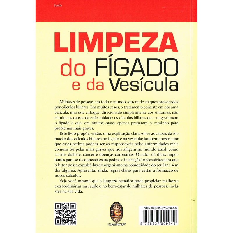 Autor: Andreas Mortiz - Gênero: Saúde - Páginas: 496 - Tamanho: 16,00 x 23,00 - Sinopse: "Milhares de pessoas em todo o mundo sofrem de ataques provocados por cálculos biliares. Em muitos casos, o tratamento consiste em operar a vesícula, mas este enfoque, direcionado simplesmente aos sintomas, não elimina as causas da enfermidade: os cálculos biliares que congestionam o fígado e que, em muitos casos, apenas preparam o caminho para problemas mais graves. Este livro propõe, então, uma explicação clara sobre as causas da formação dos cálculos biliares no fígado e na vesícula; também mostra por que essas pedras podem ser as responsáveis pelas enfermidades mais comuns ou pelas mais graves que nos afligem no mundo atual, como artrite, diabete, câncer e doenças coronárias. O autor dá dicas importantes para se reconhecer essas pedrase instruções necessárias para que o leitor possa expulsá-las do organismo na comodidade do seu lar e sem dor alguma. Apresenta, ainda, regras claras para evitar a formação de novos cálculos. Veja você mesmo que a limpeza hepática pode propiciar melhoras extraordinárias na saúde e no bem-estar de milhares de pessoas, inclusive na sua vida."